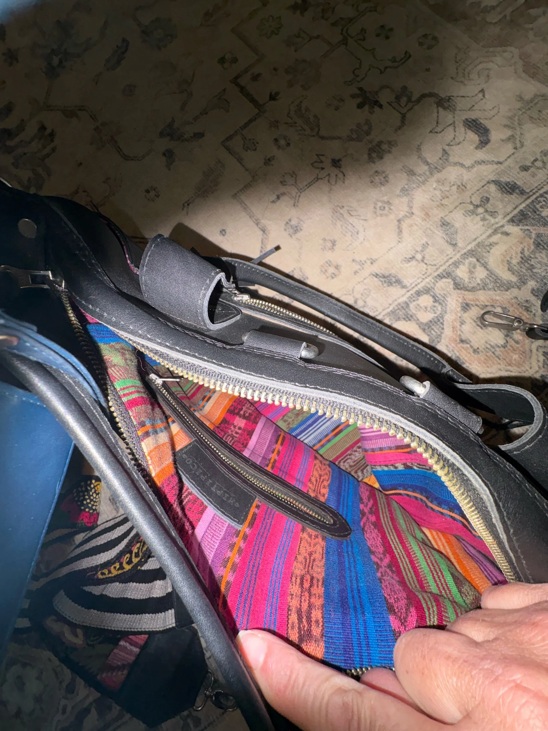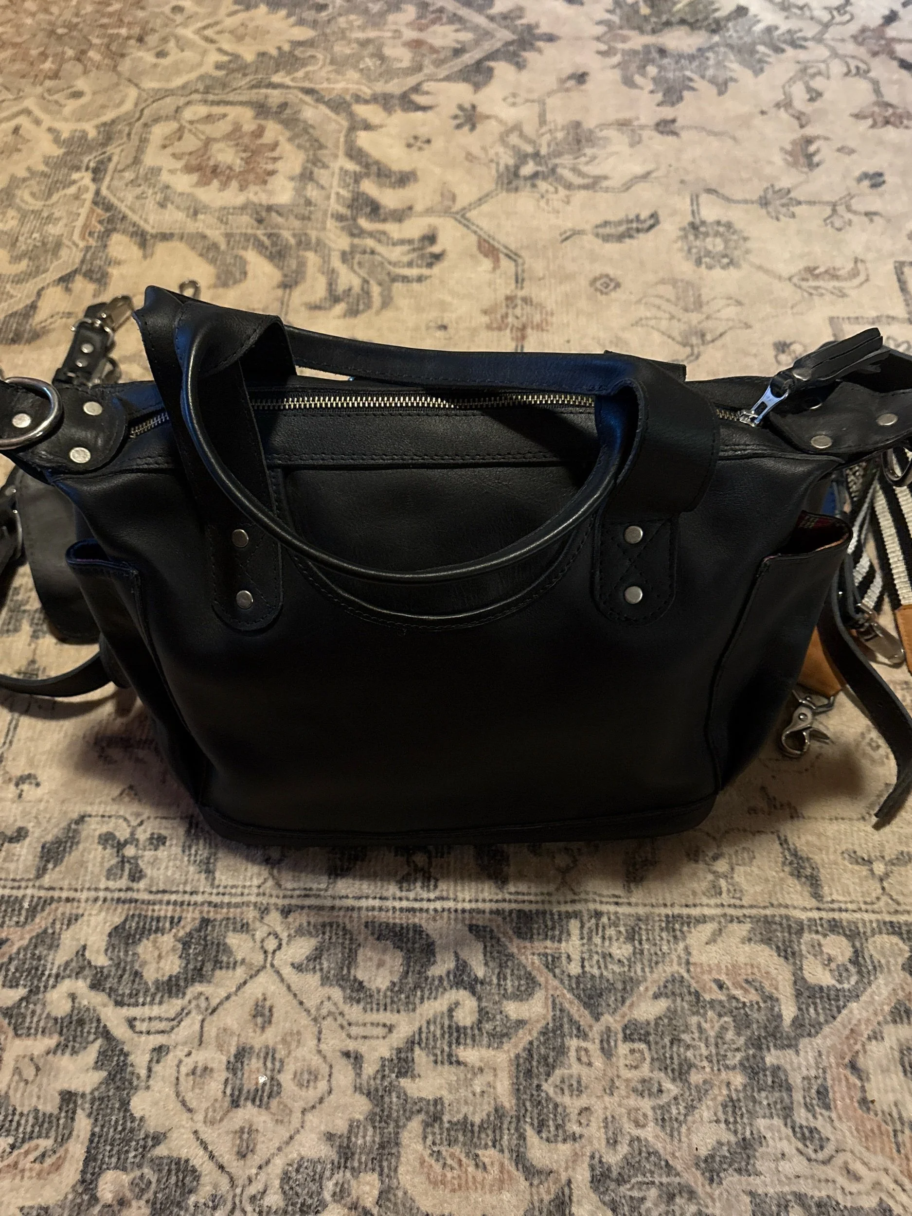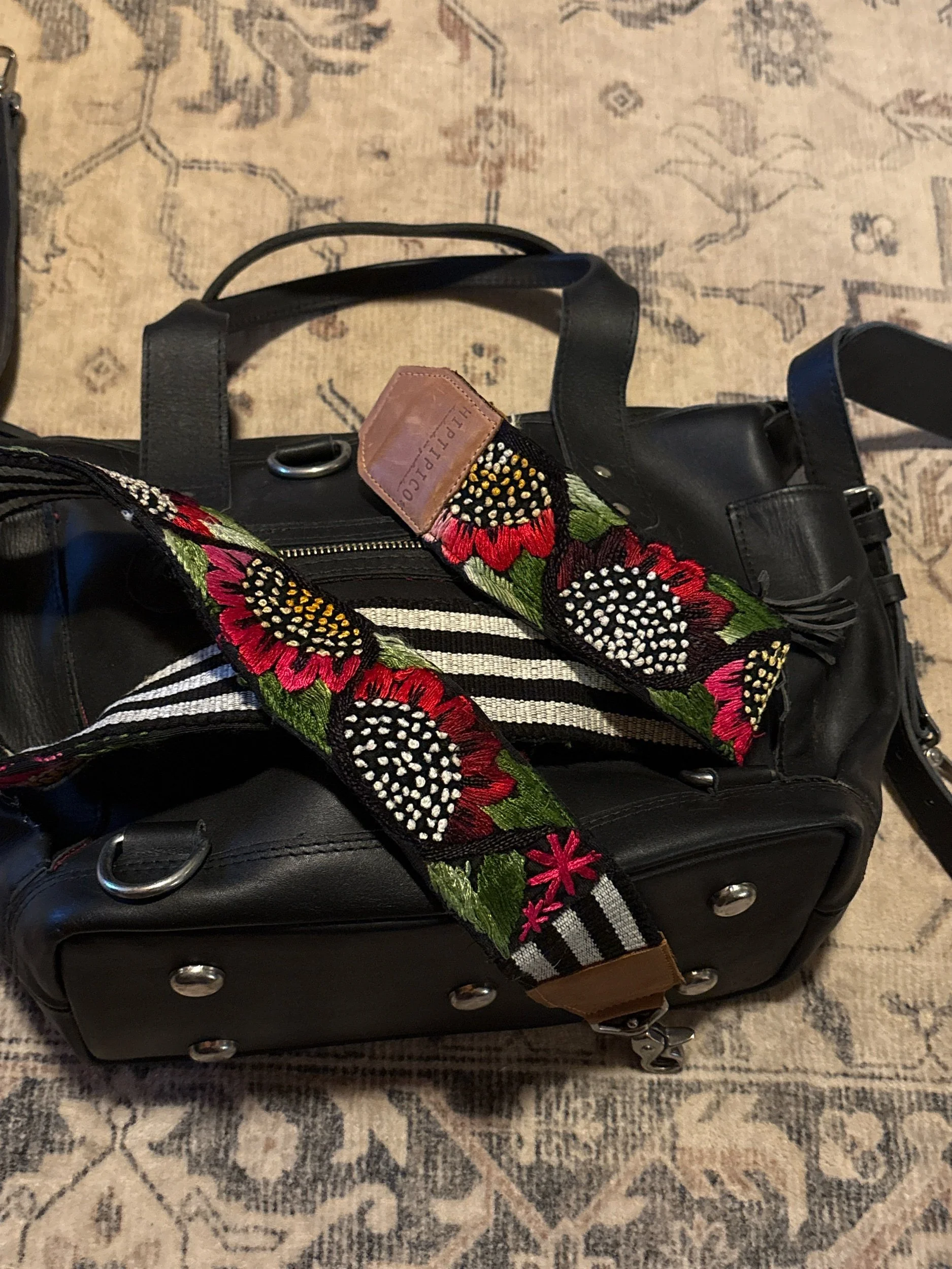 Very cool bag! Beautiful work! Wear it as a backpack or shoulder bag. There are 6 straps - one black shoulder strap, 2 black backpack straps, 3 reversible guitar-style straps to use as a shoulder bag or backpack. Retail over $350.