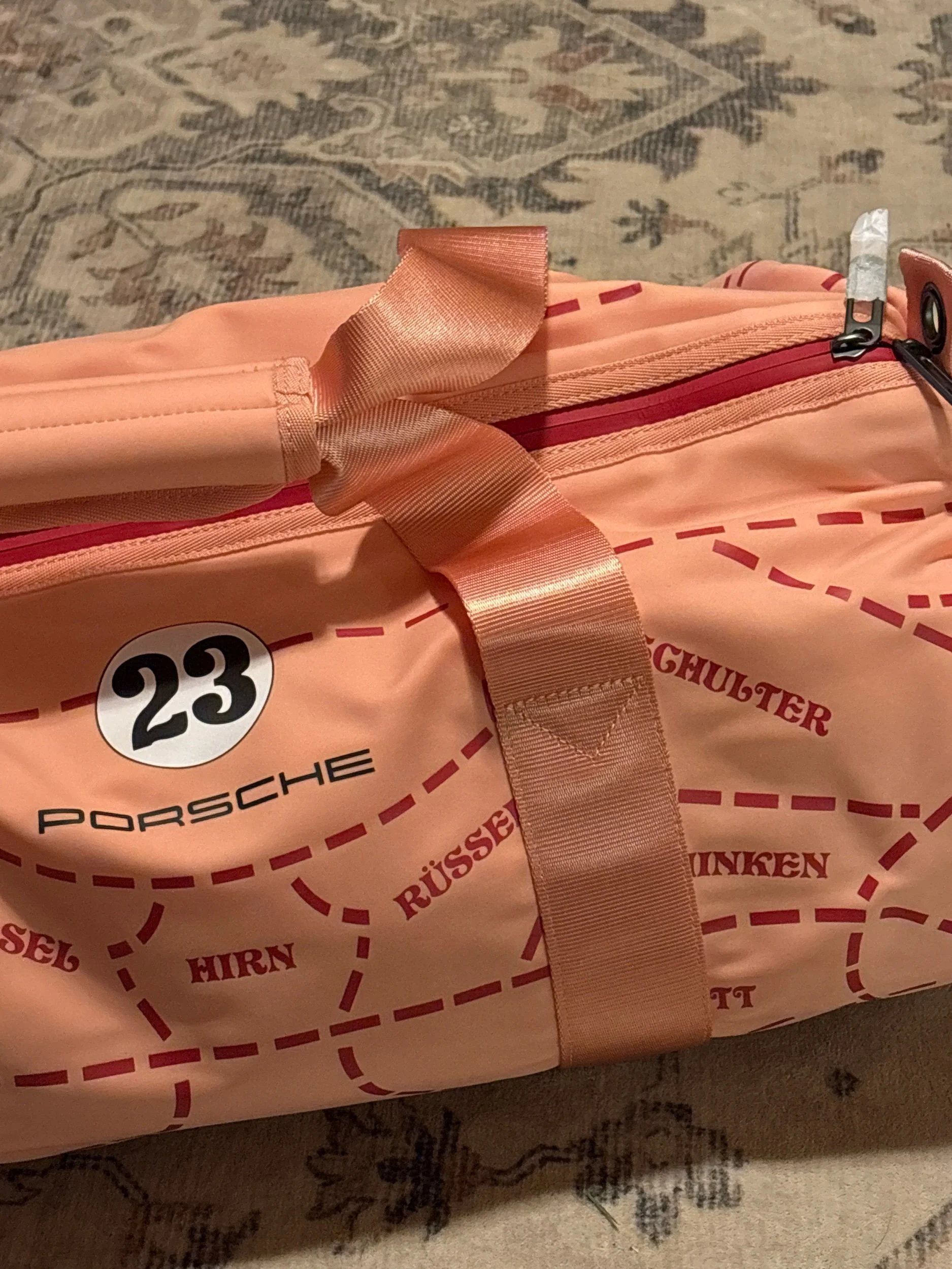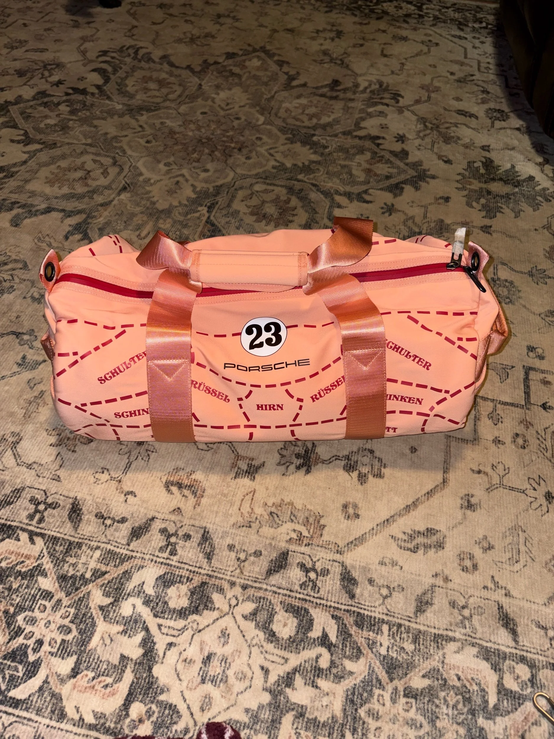 The917 Pink Pig No. 23 sports bag in the legendary Pink Pig design with red details and a detachable shoulder belt. The spacious main compartment has a small inner compartment with a zip, in which personal items can be safely stowed away. Two side pockets offer additional space.