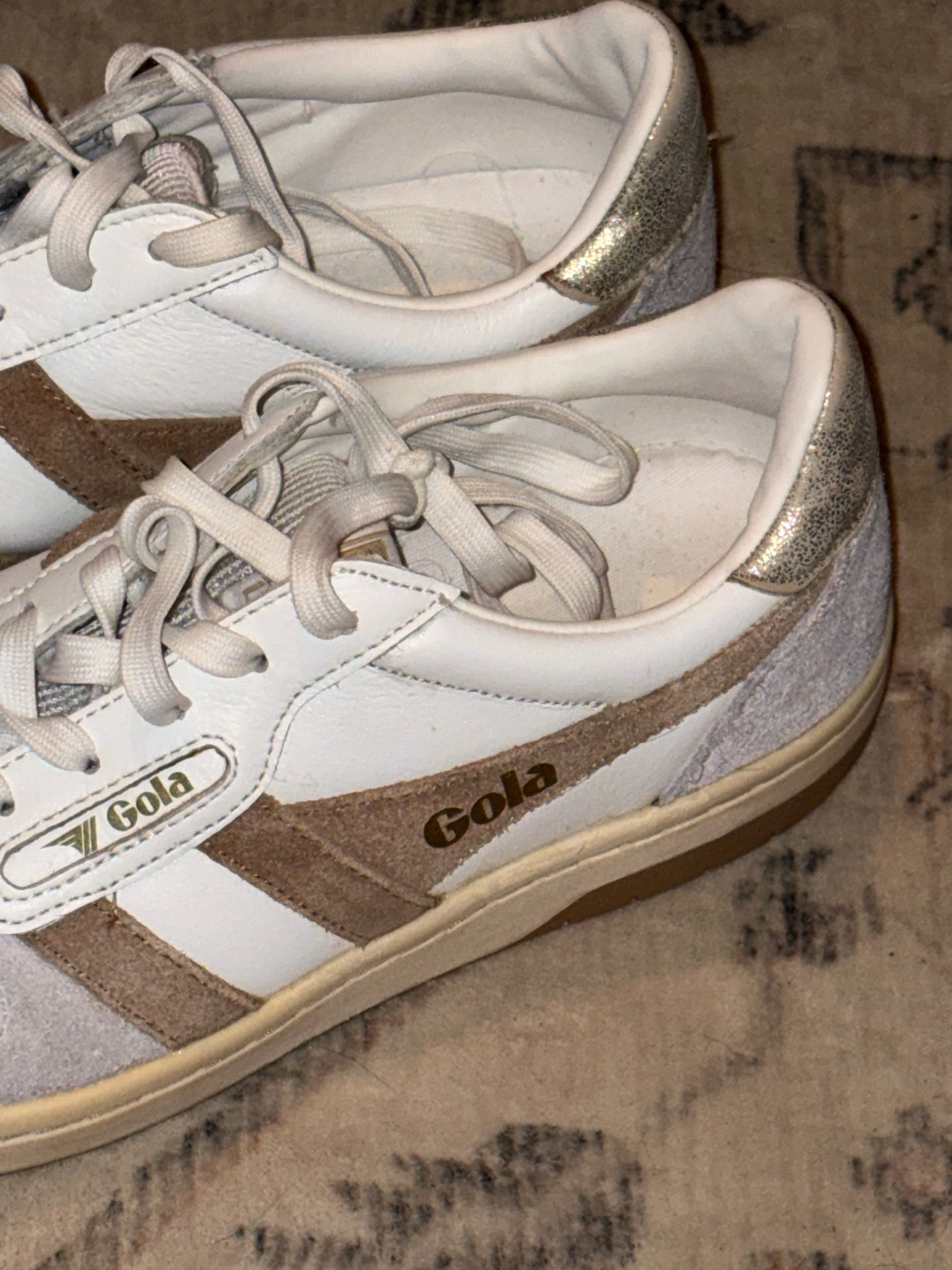 The Gola Hawk sneakers are vintage-inspired trainers featuring a white leather upper with suede overlays and a rubber sole. Great looking shoes with lots of life left. Retail $120!