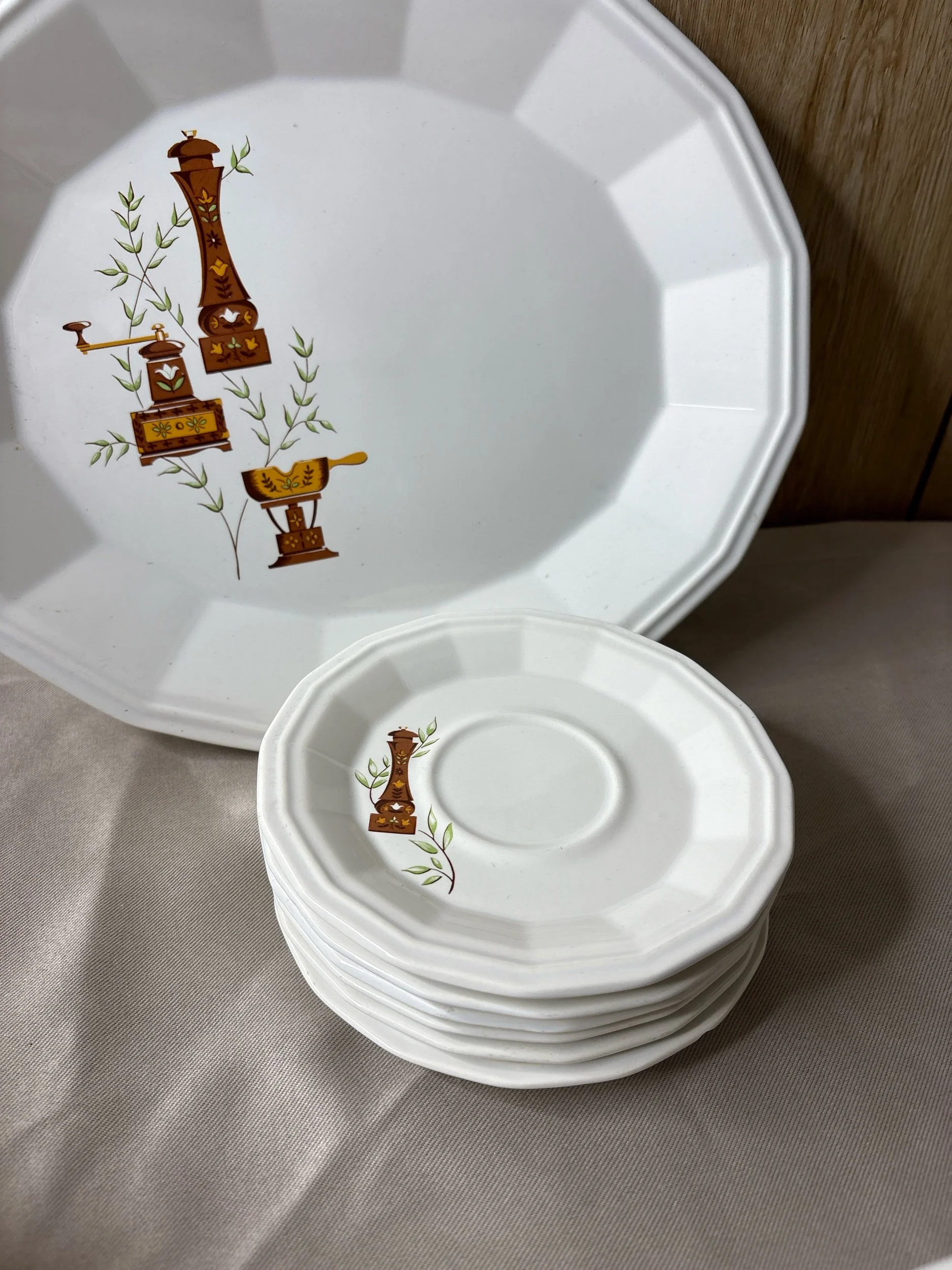 One platter, one serving bowl, six dinner plates and six saucers. Excellent condition other than a few few minor chips as pictured.