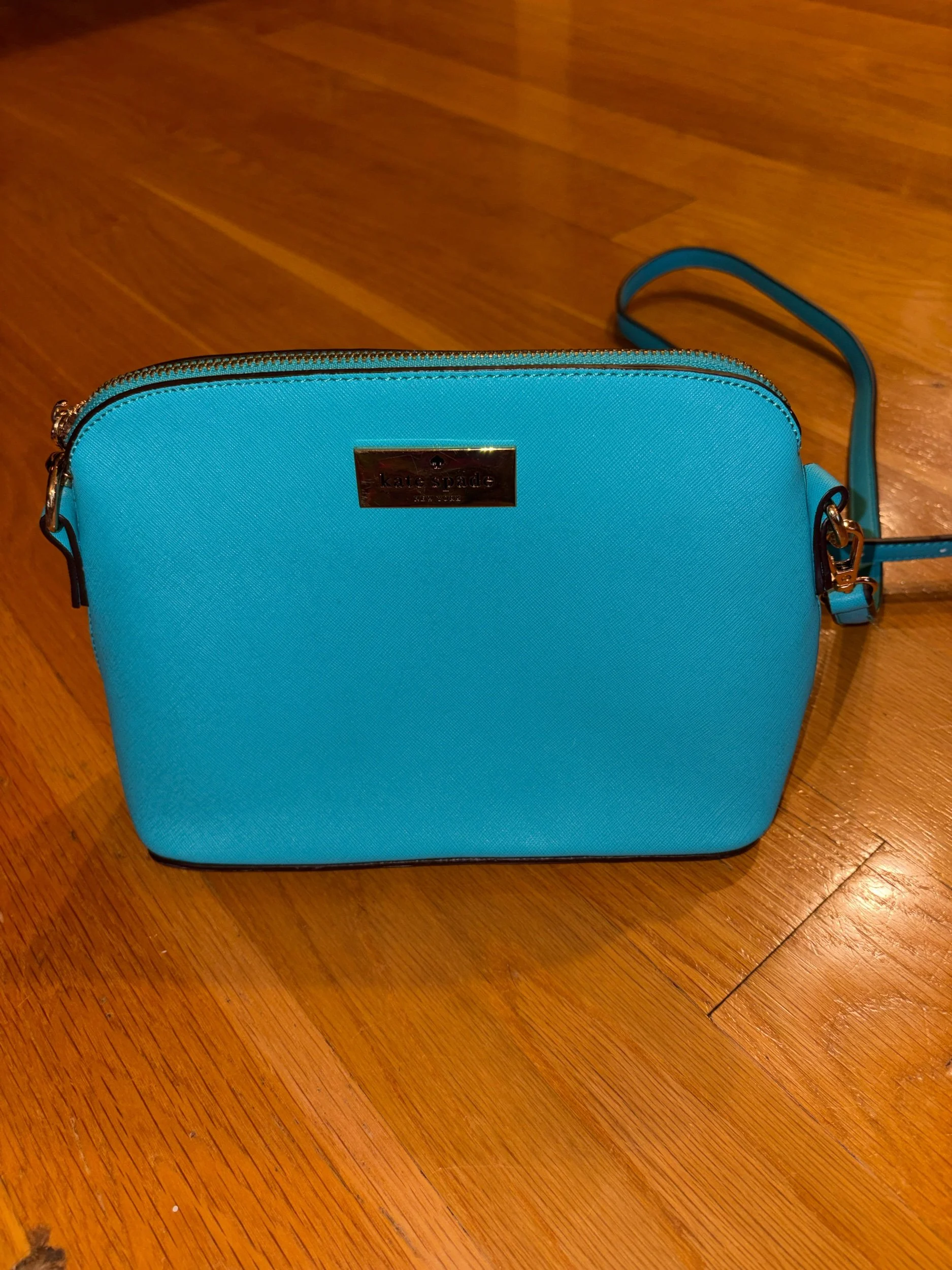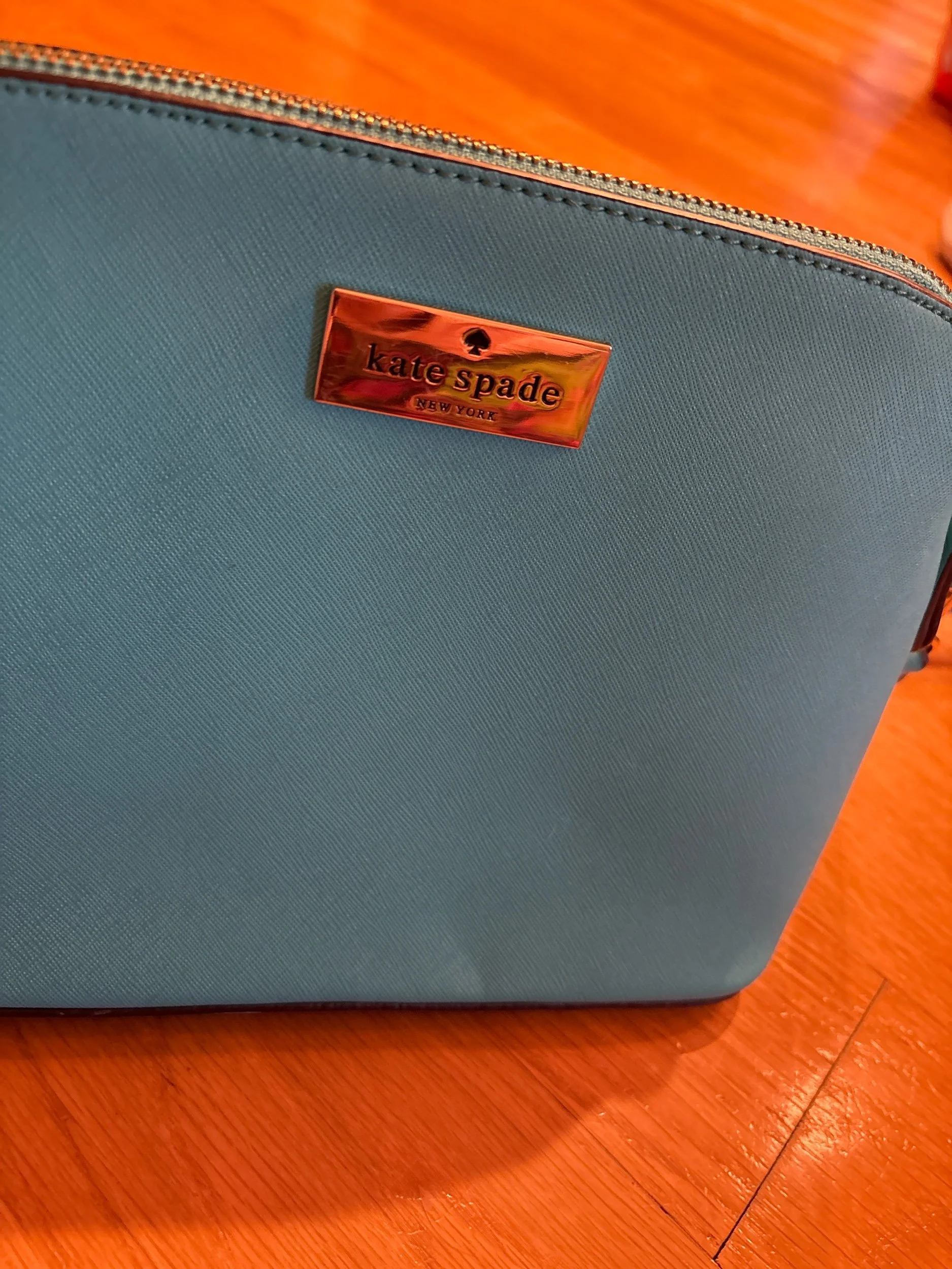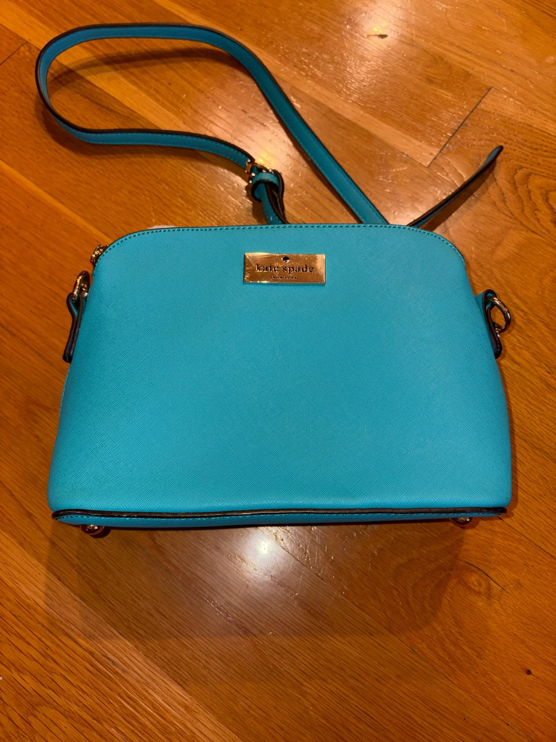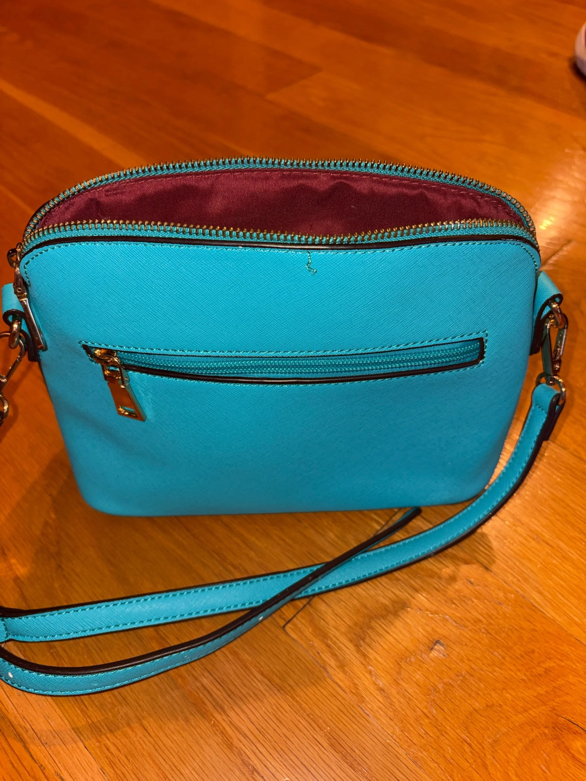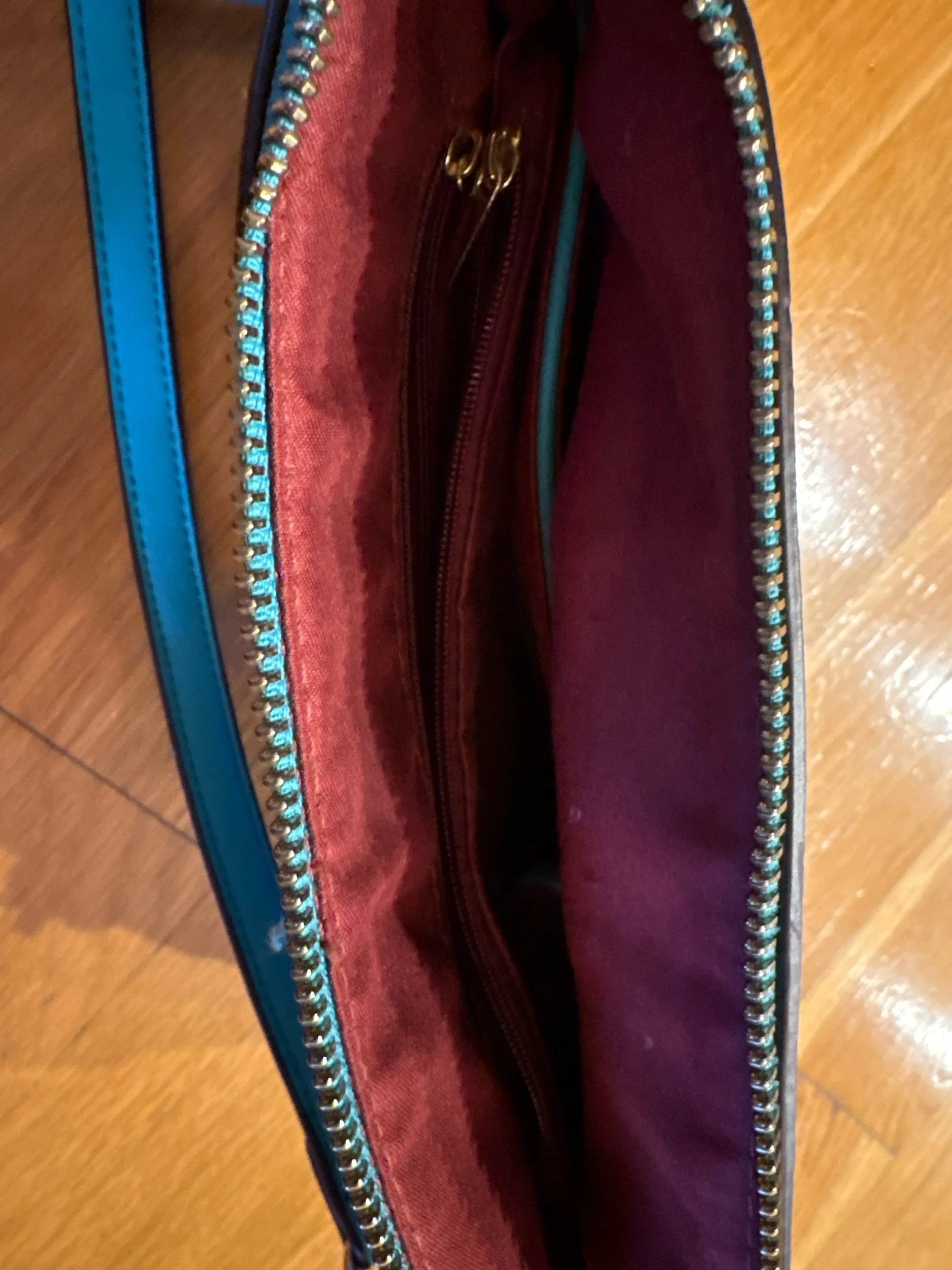 Great size for everyday or errands. One center pocket and inner pockets on each side - also one zippered outer pocket. Great cheery color! No scuffs or marks.