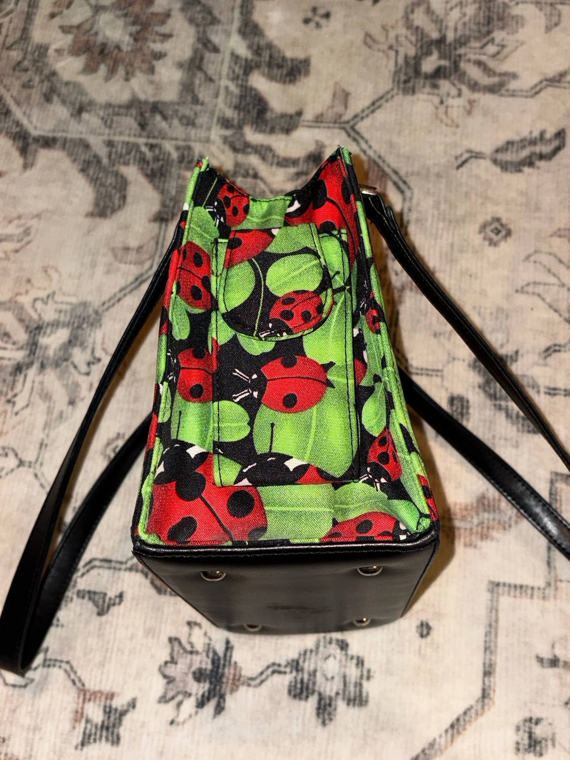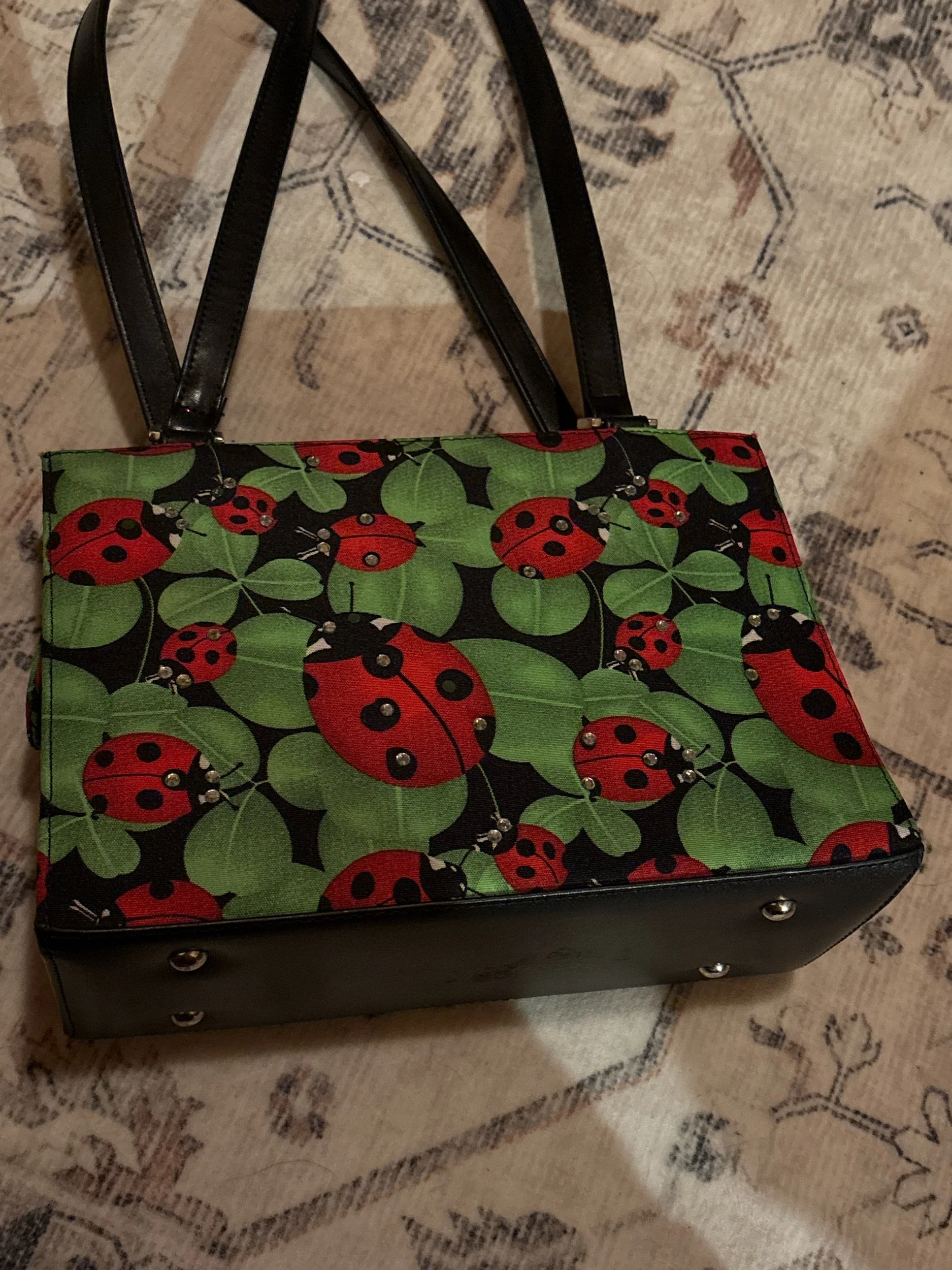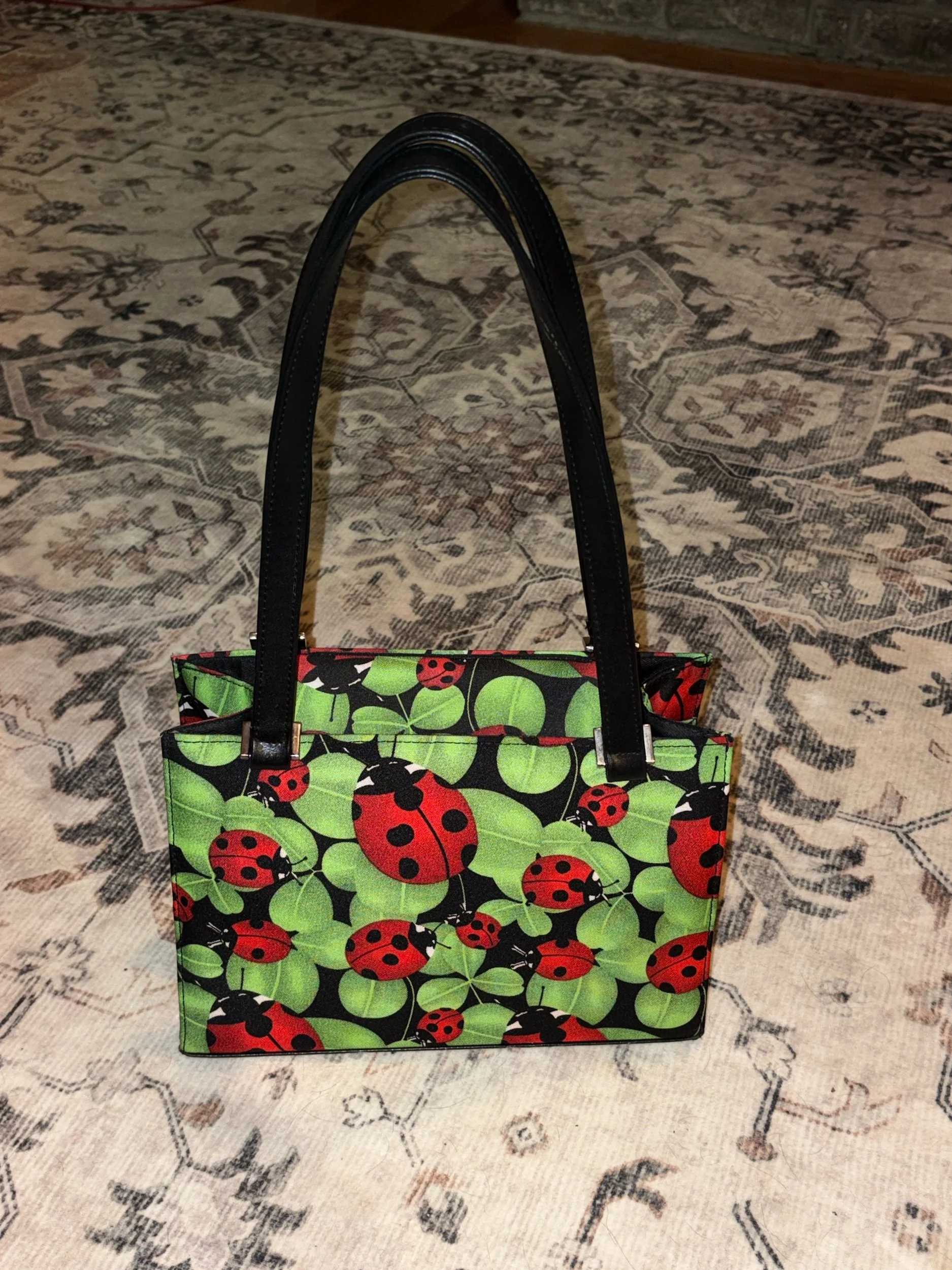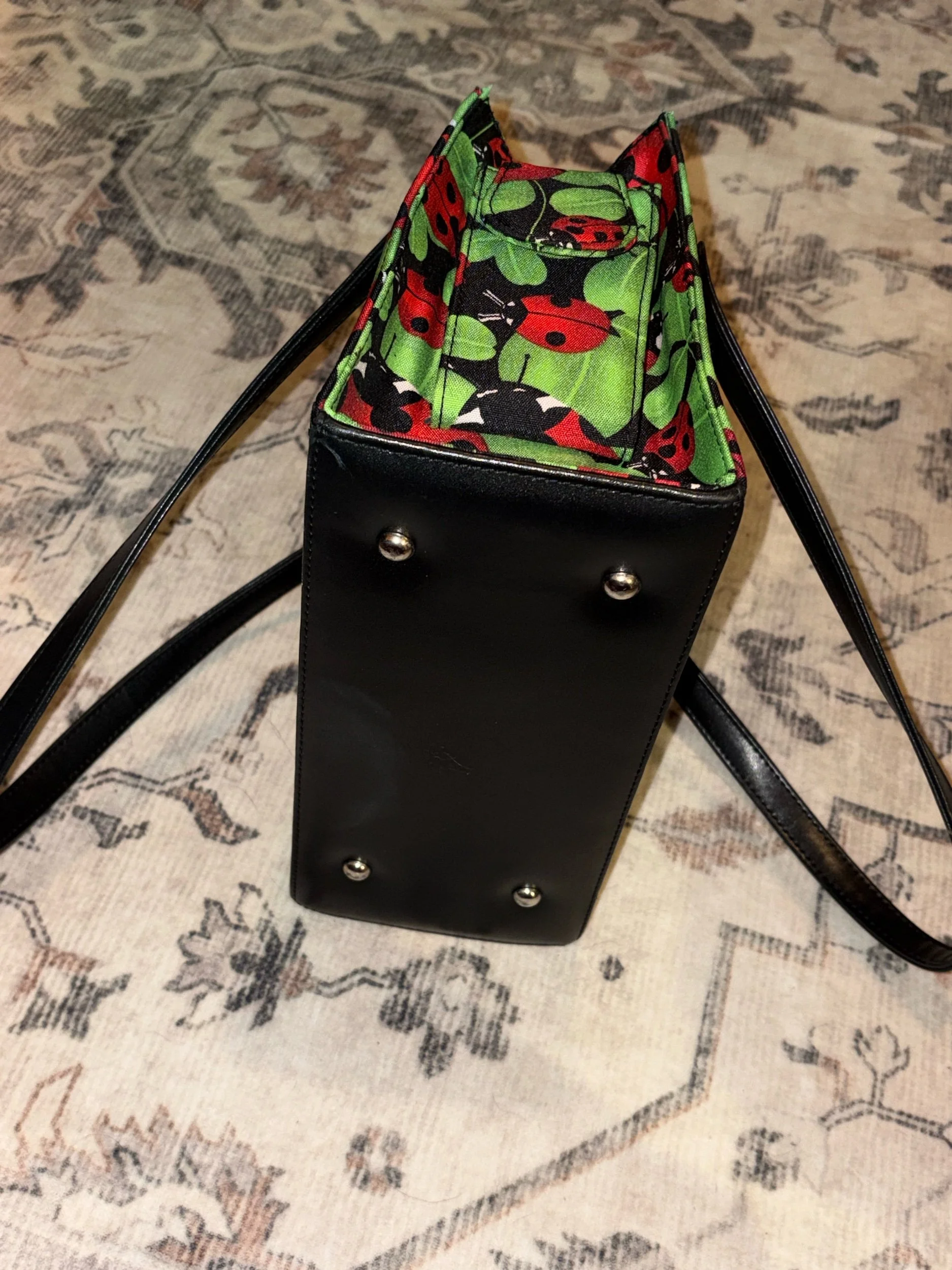 Great size and strap length. Really great condition. One zippered side compartment in addition to main compartment. Flap has magnetic snap for easy closure. Super fun bag.