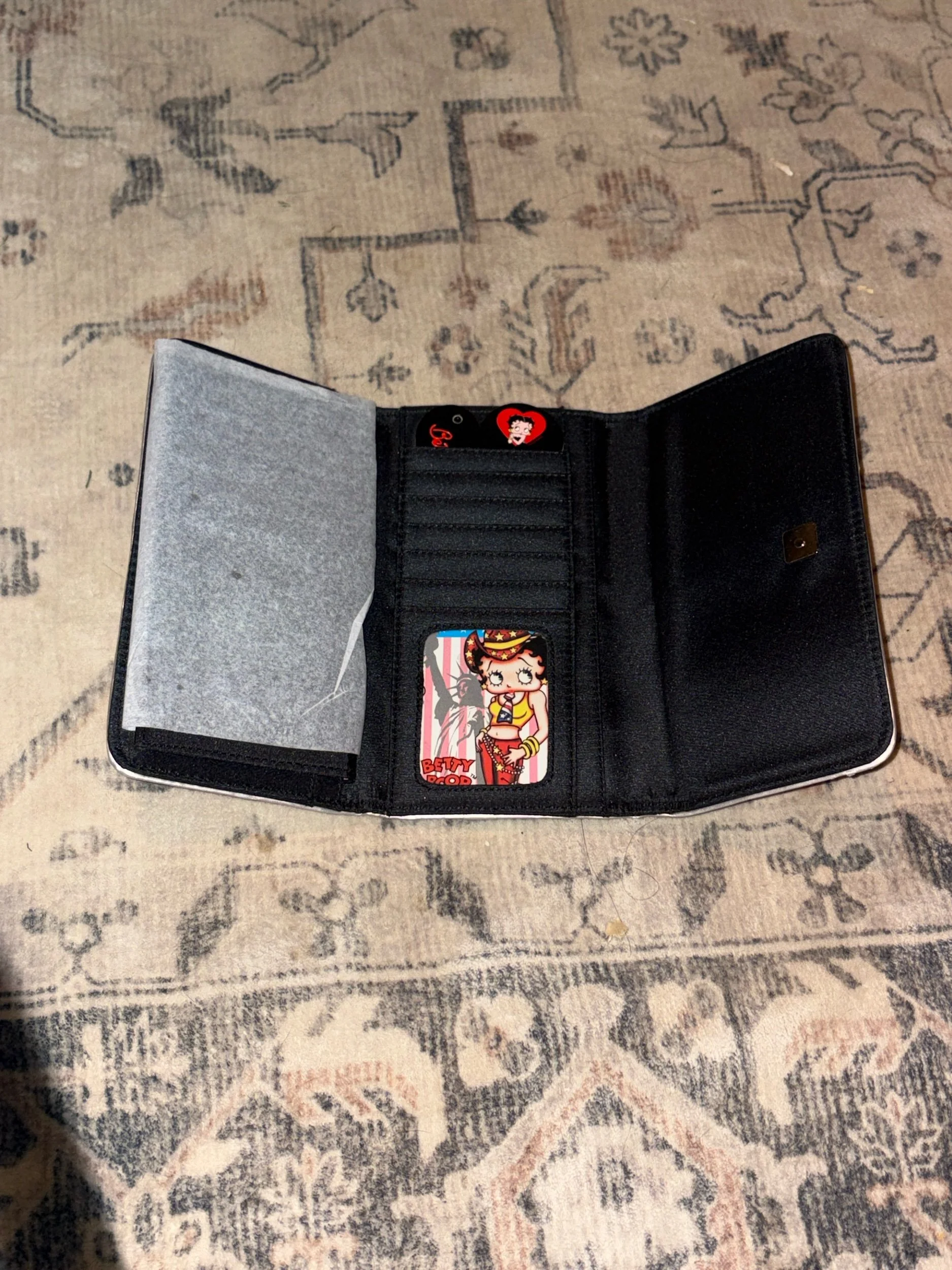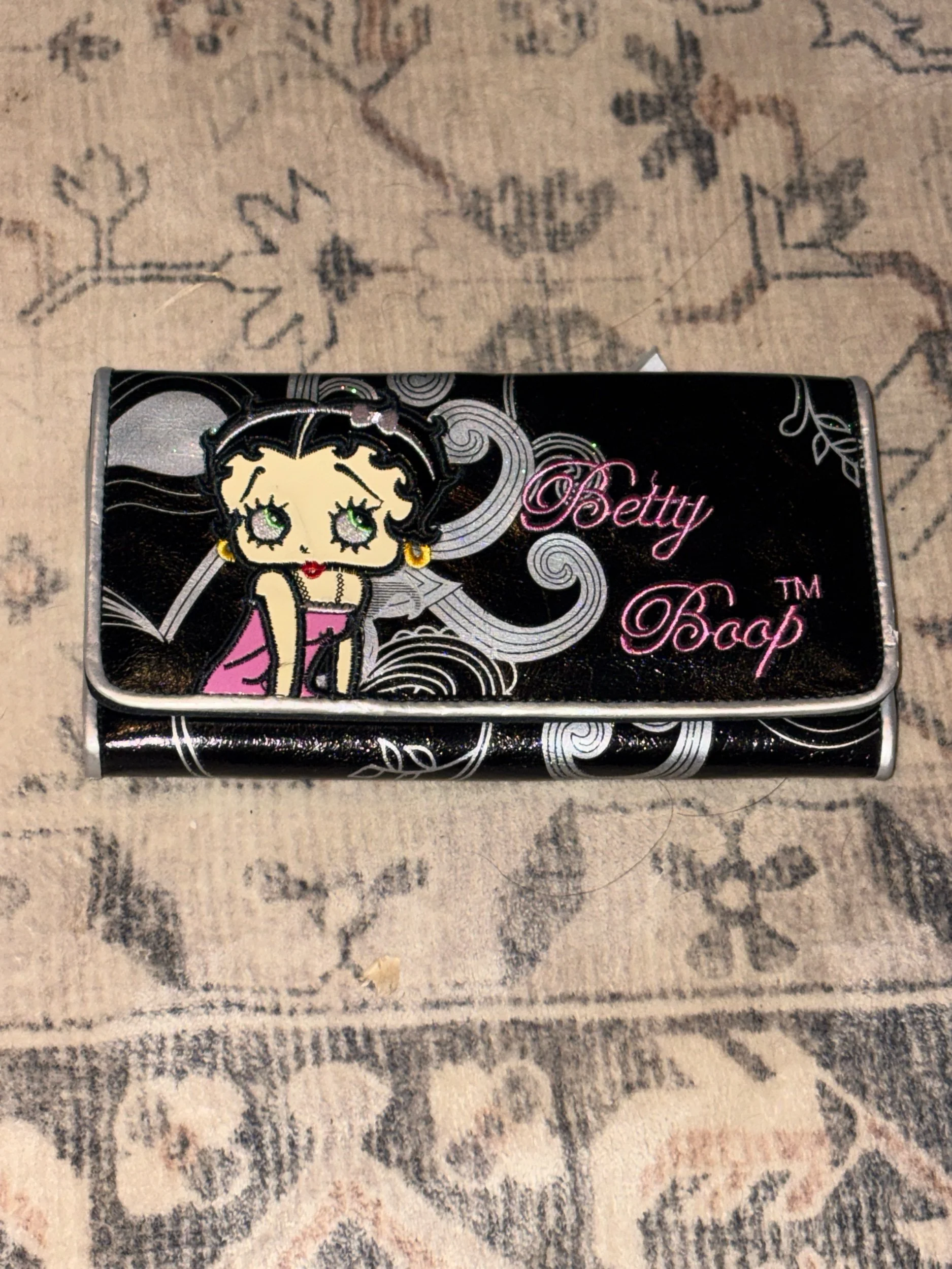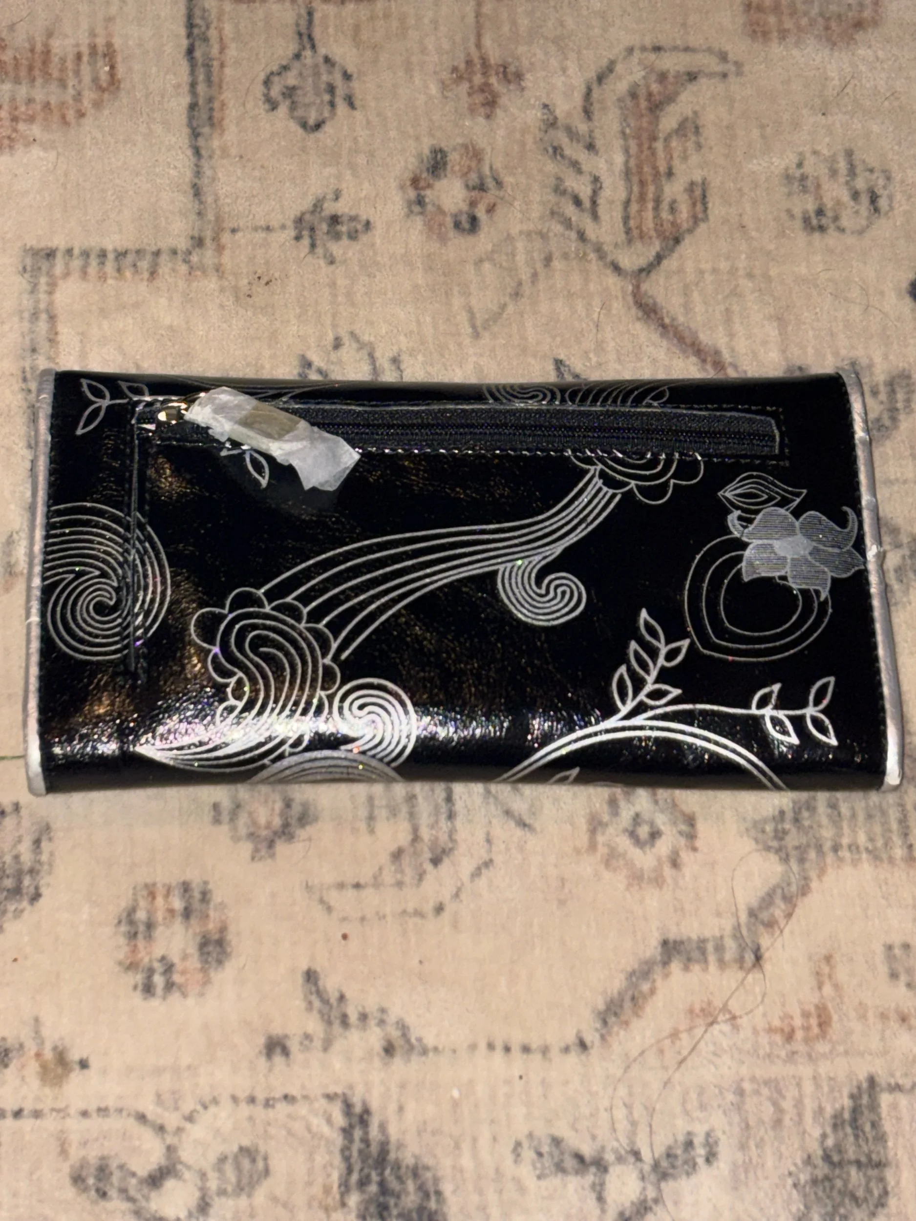 This is a great wallet with a spot for your checkbook, cards and cash! The silver design has just the right amount of shimmer!