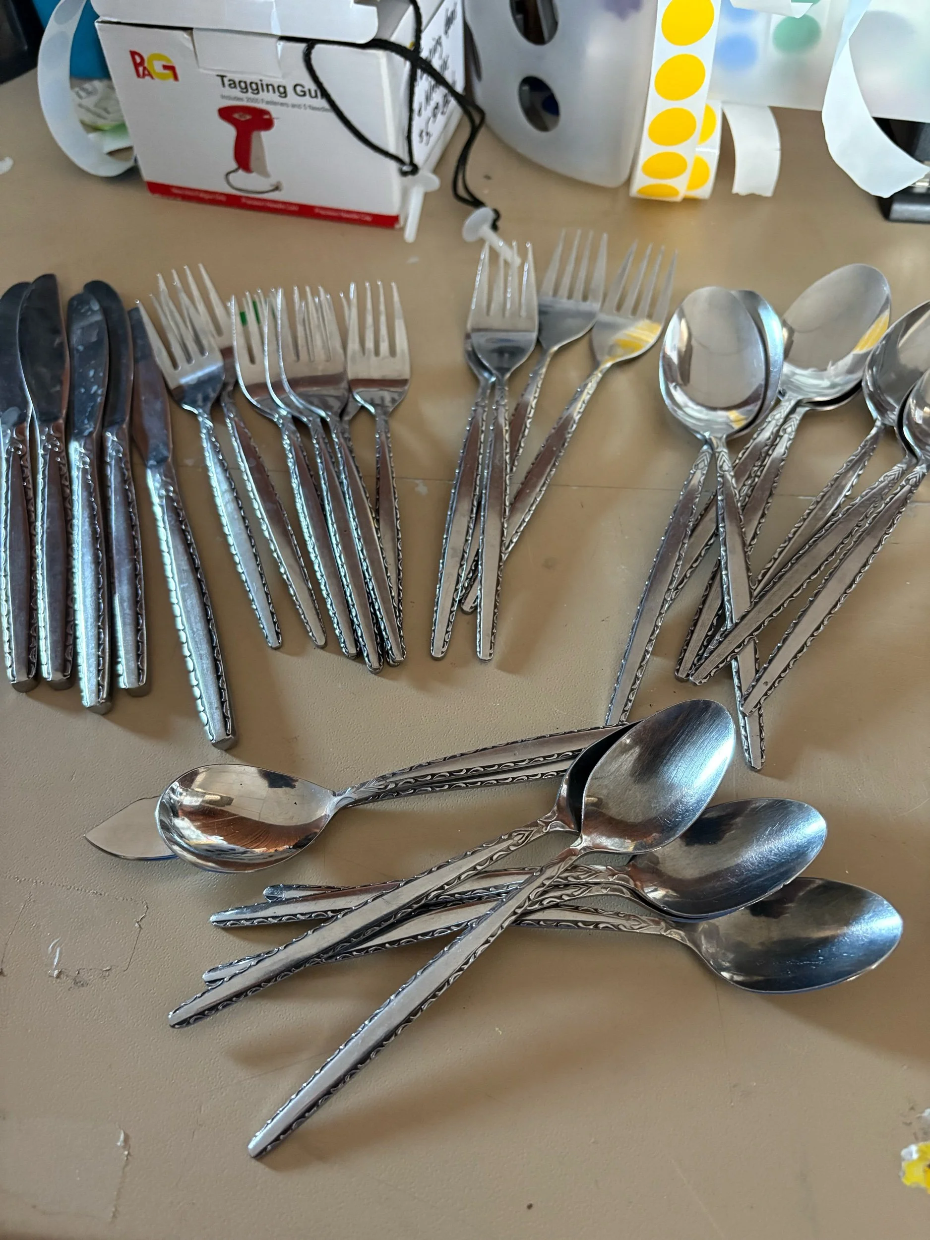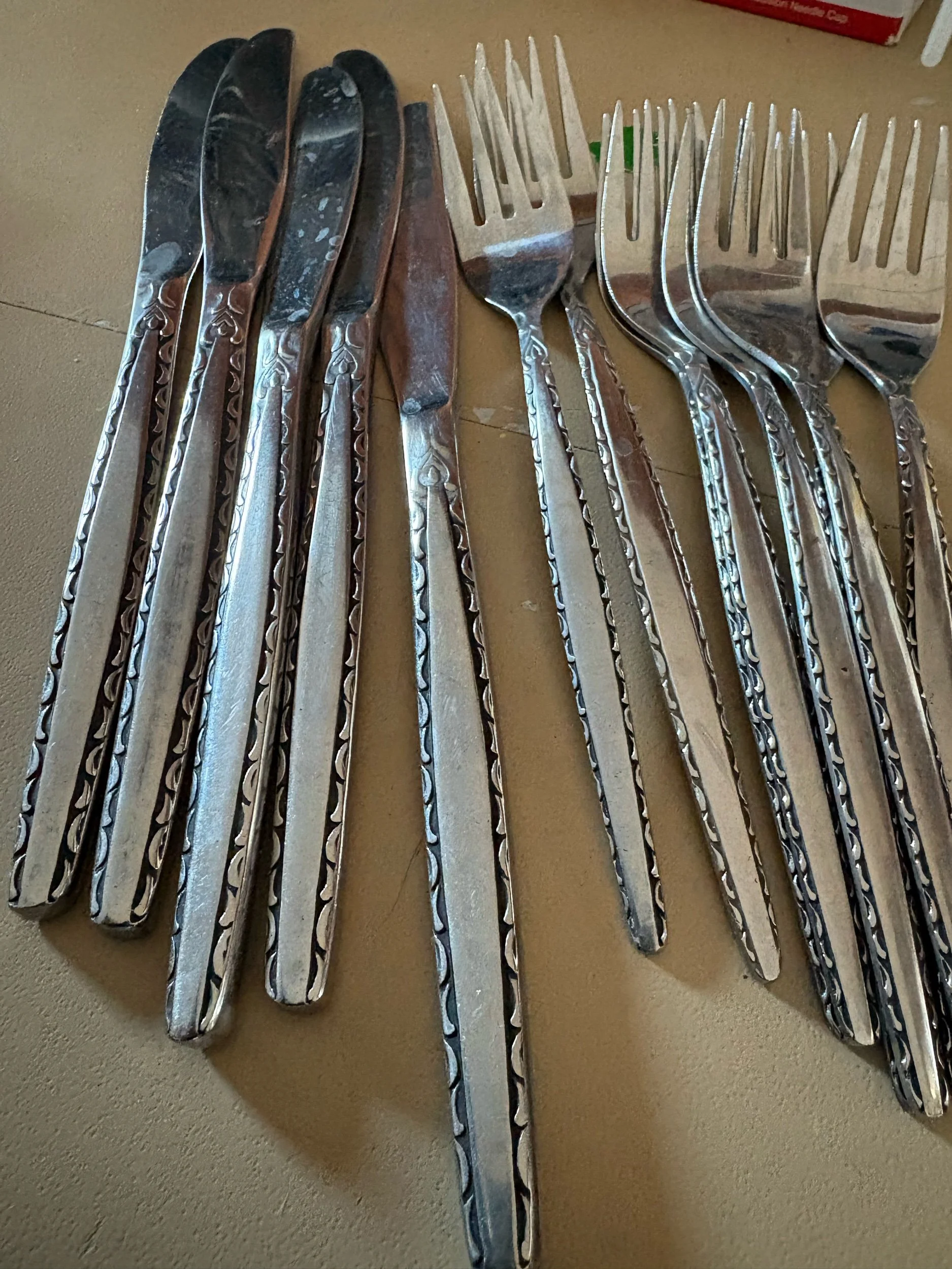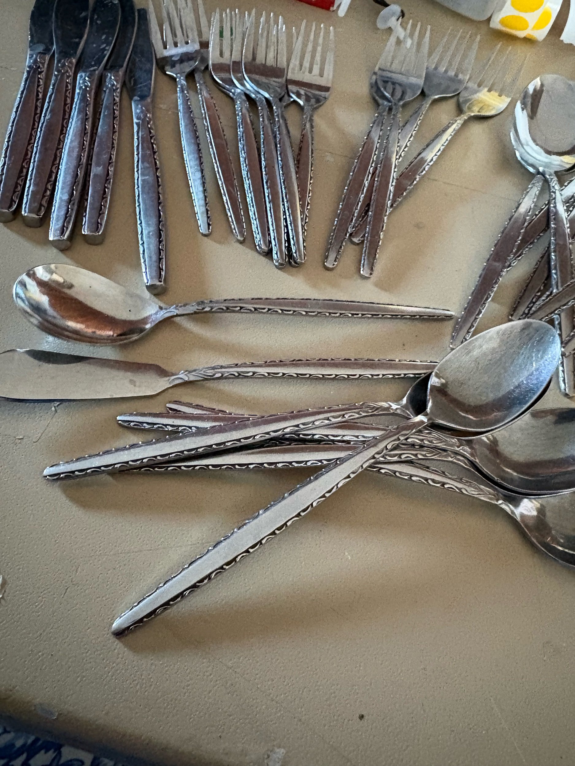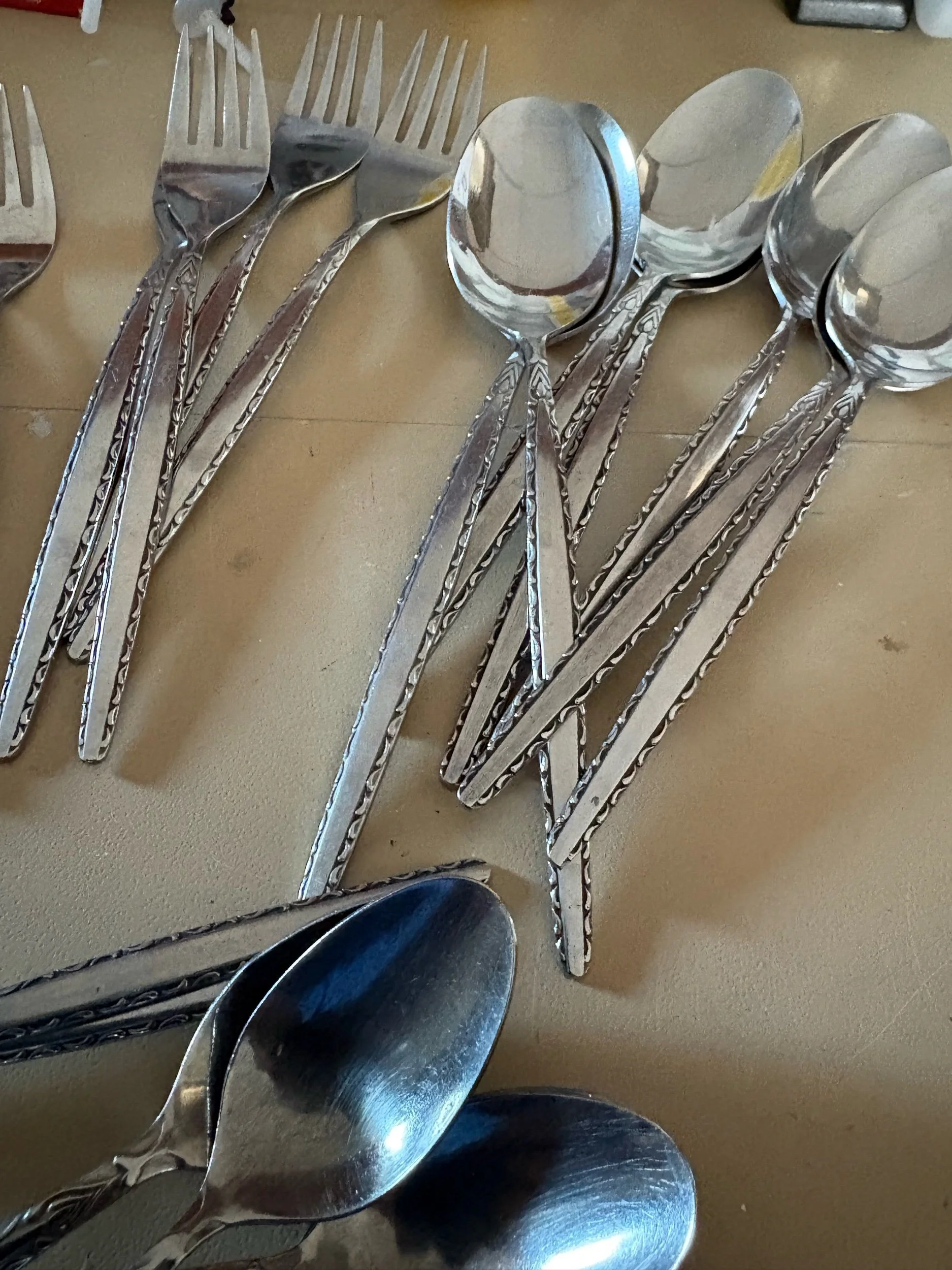 Online Store › Partial set of Oneida Venetia, introduced in 1968, featuring a scroll outline on a brushed handle Image 1 of 4 Image 2 of 4 Image 3 of 4 Image 4 of 4 Partial set of Oneida Venetia, introduced in 1968, featuring a scroll outline on a brushed handle $35.00 There 5 butter knives, 8 smaller forks, 4 longer forks, 7 big spoons, 5 small spoons, one spreader, and one sugar spoon Add To Cart Added! There 5 butter knives, 8 smaller forks, 4 longer forks, 7 big spoons, 5 small spoons, one spreader, and one sugar spoon