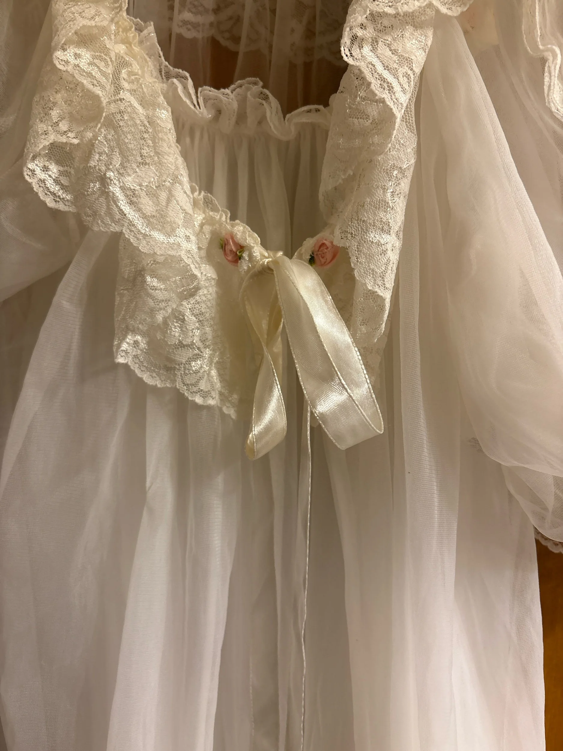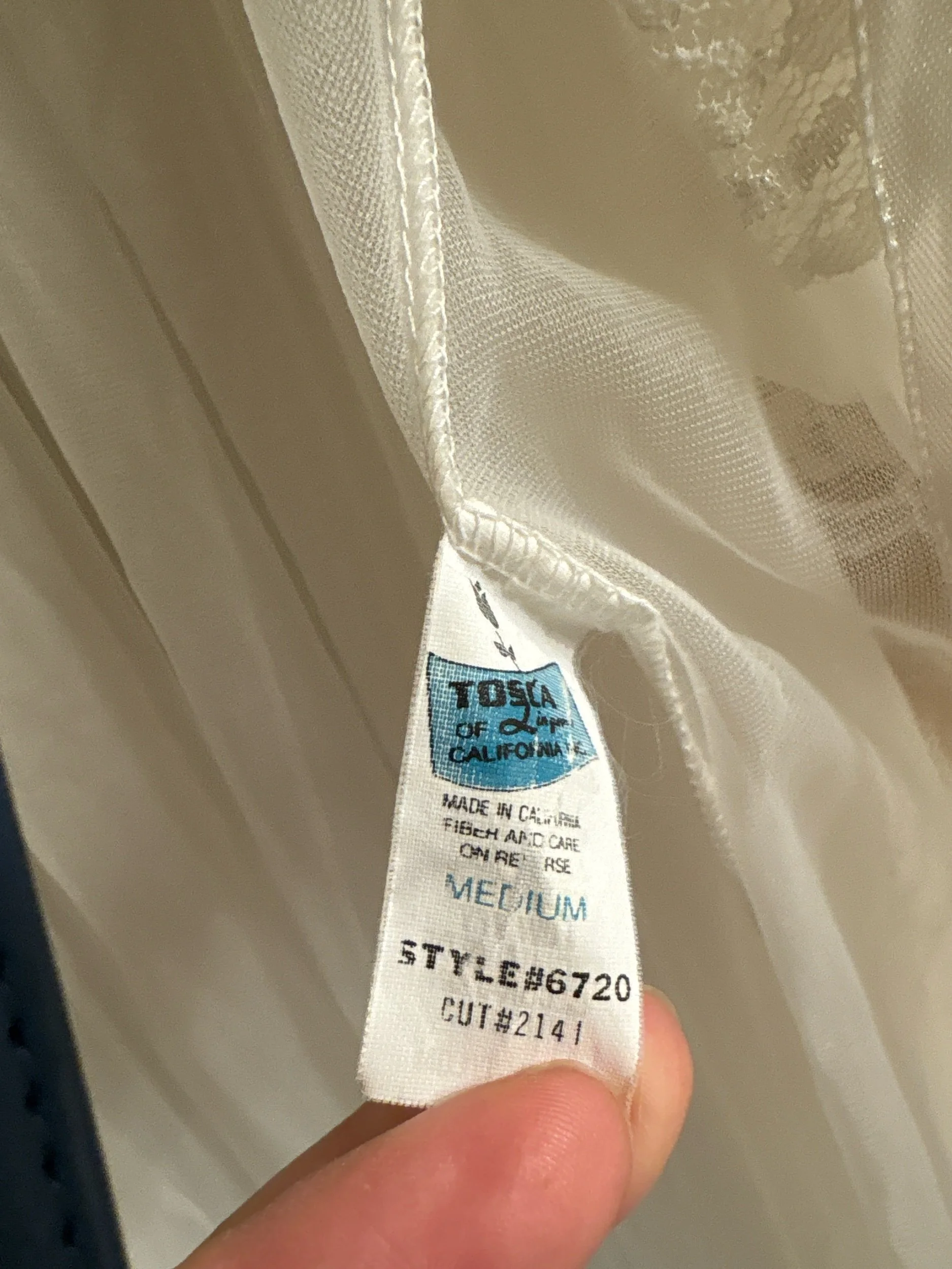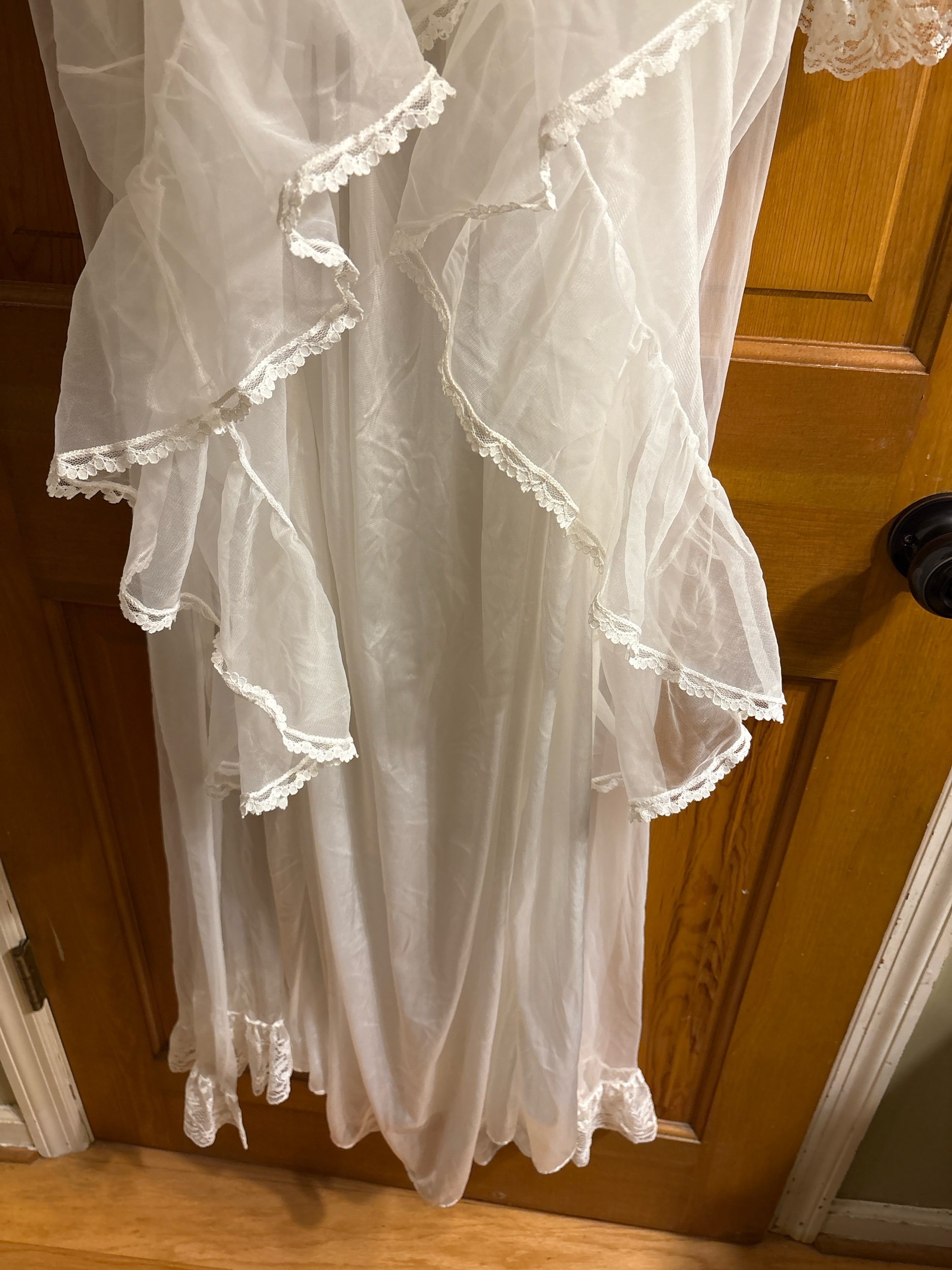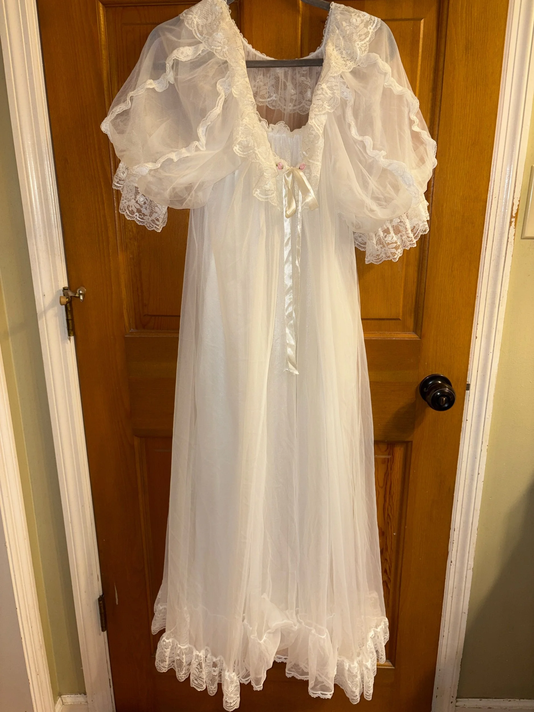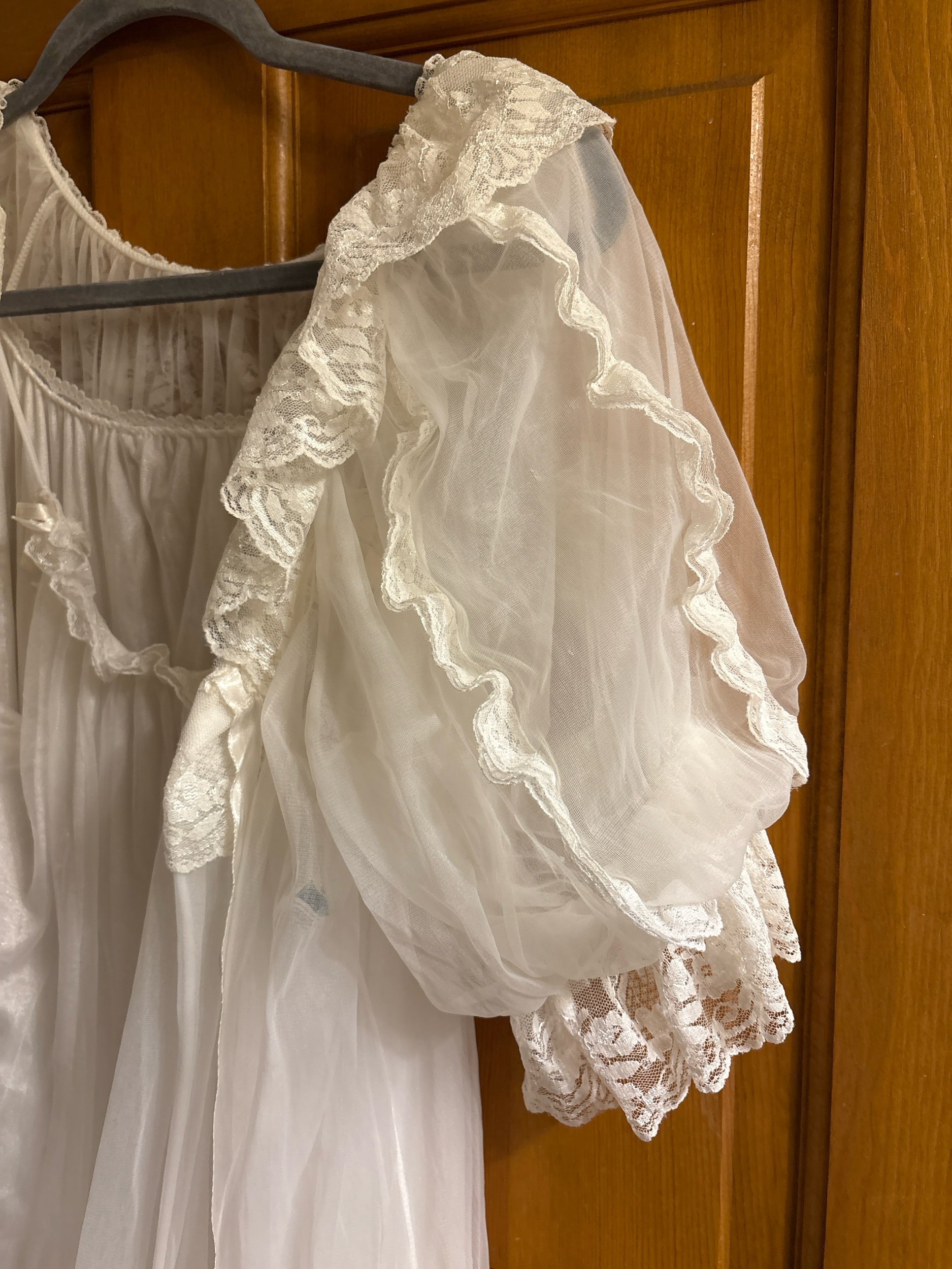 Online Store › vintage Tosca of California white sheer nylon peignoir with lace trim and puffed sleeves size medium Image 1 of 6 Image 2 of 6 Image 3 of 6 Image 4 of 6 Image 5 of 6 Image 6 of 6 vintage Tosca of California white sheer nylon peignoir with lace trim and puffed sleeves size medium $75.00 Beautiful condition vintage nightgown and robe. The gown is lined. It’s sized a medium, but fits generously. Add To Cart Added! Beautiful condition vintage nightgown and robe. The gown is lined. It’s sized a medium, but fits generously.