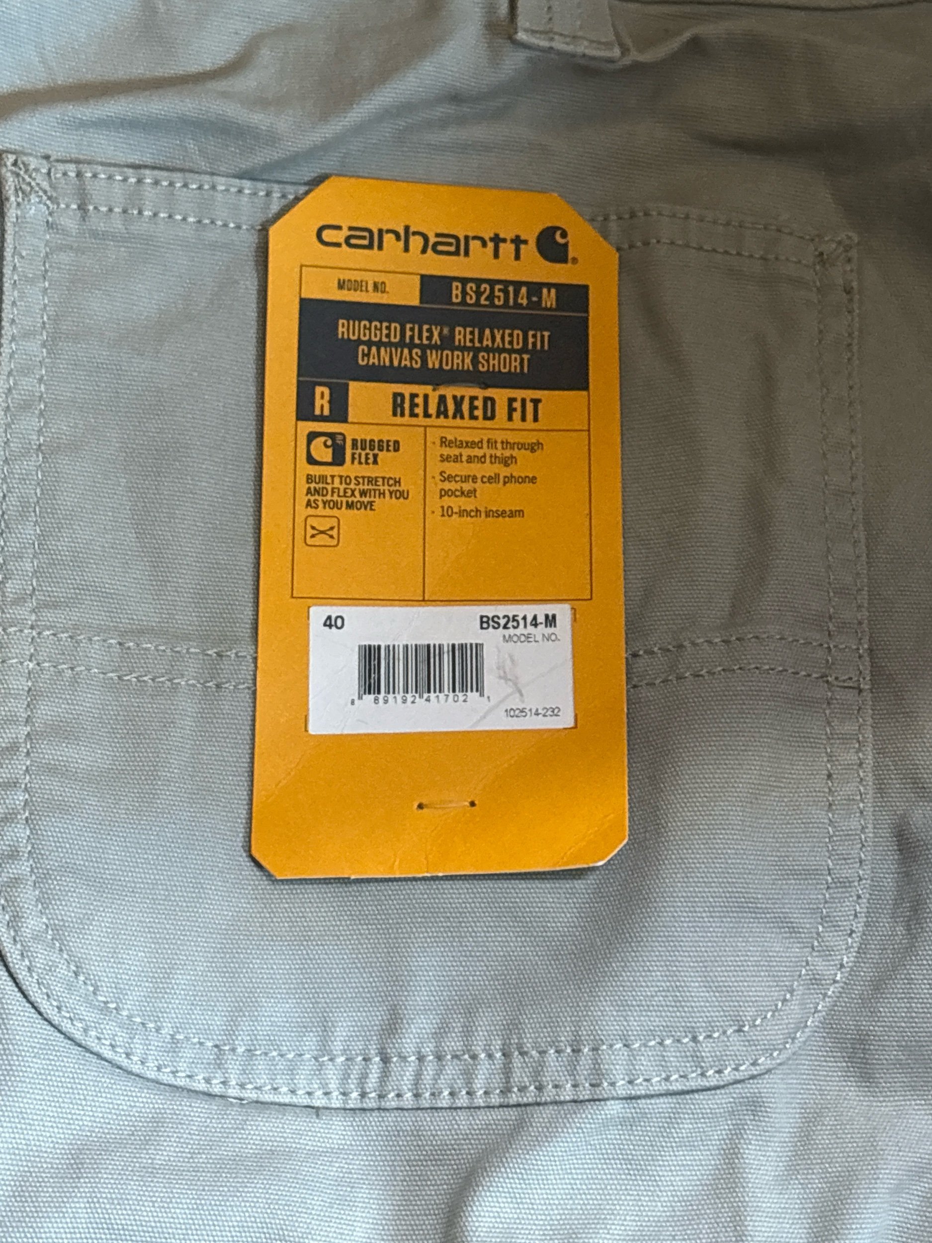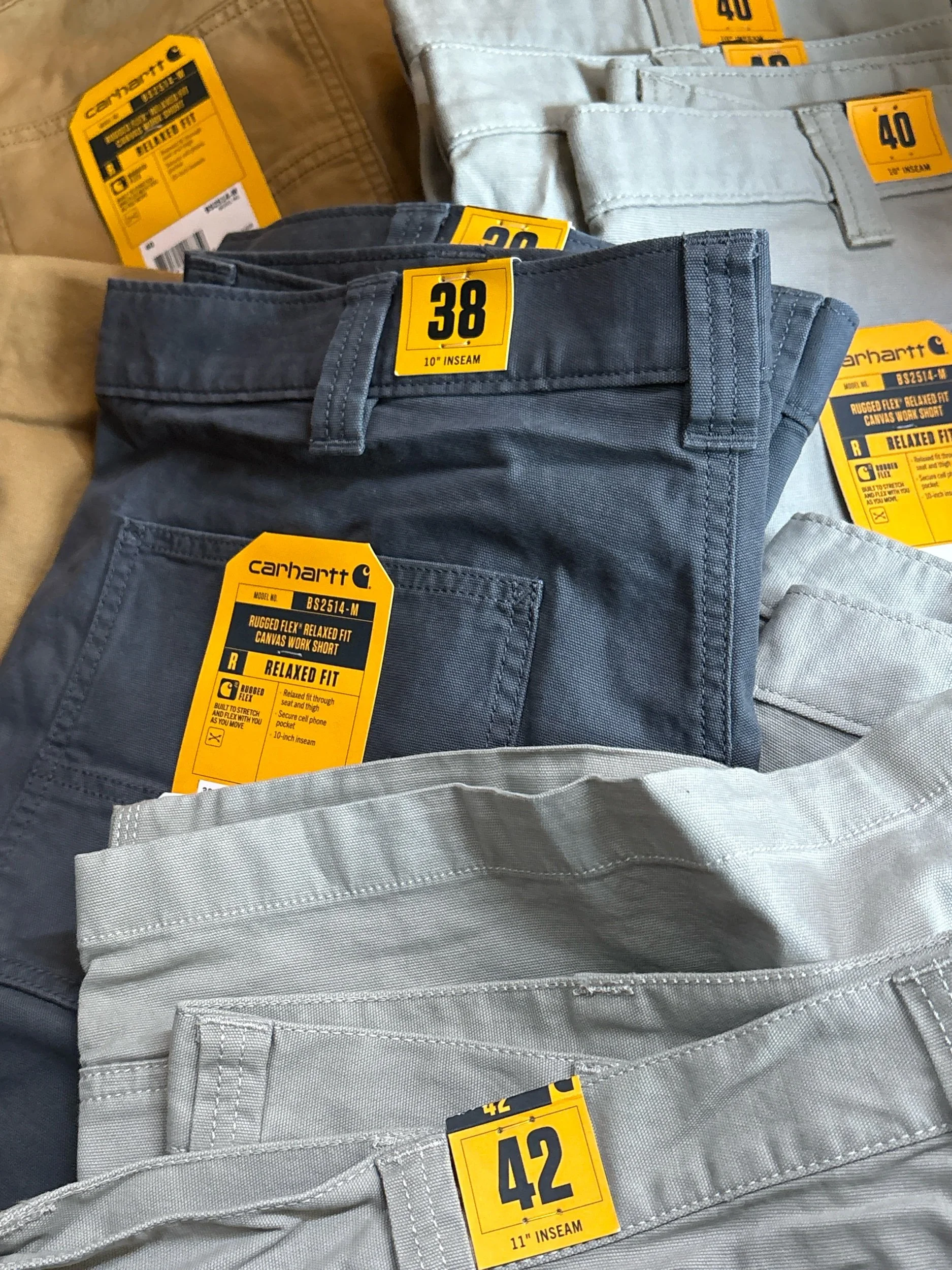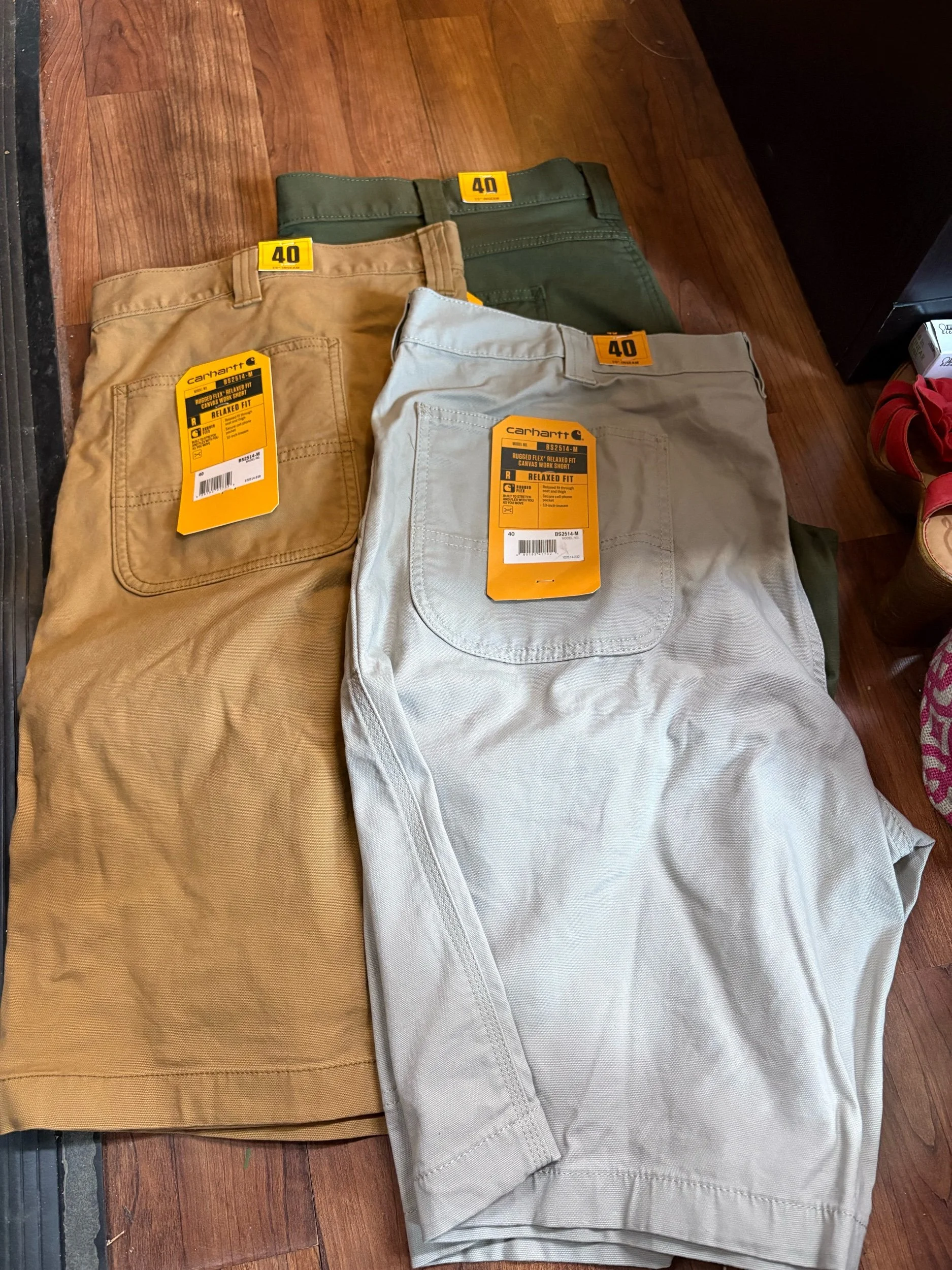 Online Store › Carhartt Relaxed fit shorts Image 1 of 3 Image 2 of 3 Image 3 of 3 Carhartt Relaxed fit shorts $22.00 We have a variety of sizes and colors. Please select the options below. Color: Select Color Light khaki Slate gray Tan Green khaki Size Size: Select Size 38 40 42 Add To Cart Added! We have a variety of sizes and colors. Please select the options below.