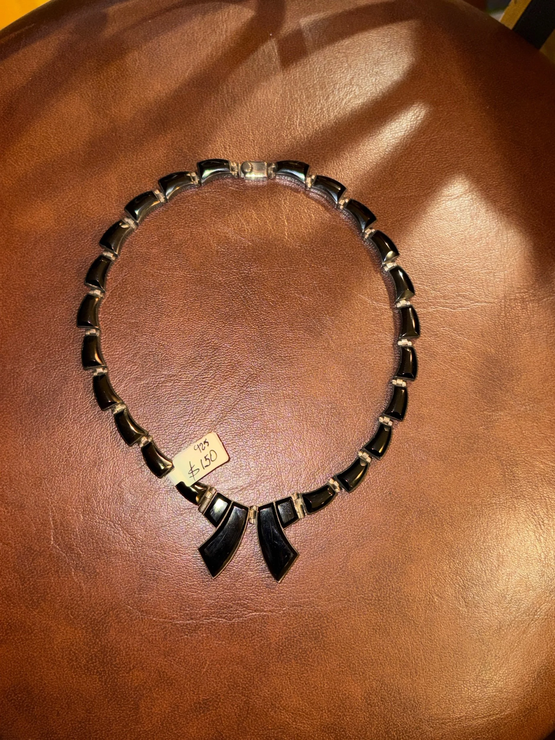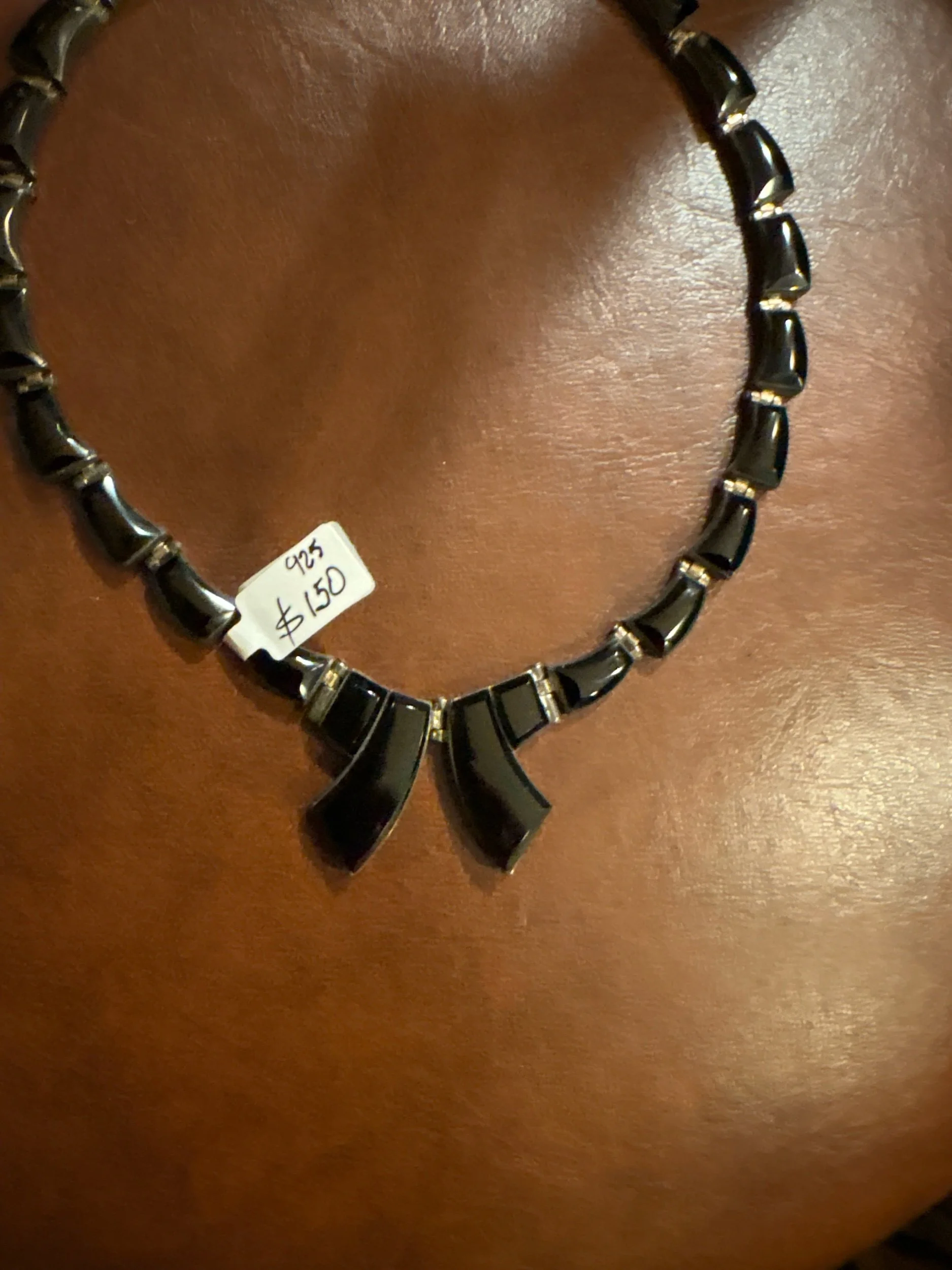 Online Store › Vintage sterling and onyx necklace Image 1 of 3 Image 2 of 3 Image 3 of 3 Vintage sterling and onyx necklace $150.00 Very unique and bargain priced compared to similar necklaces online! Will come in a hinged velvet box. Add To Cart Added! Very unique and bargain priced compared to similar necklaces online! Will come in a hinged velvet box.