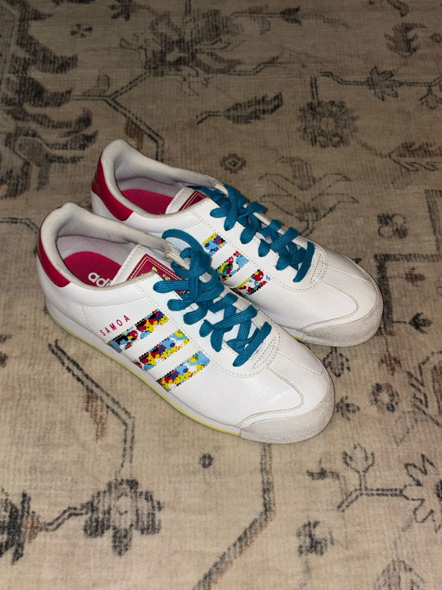 Online Store › Adidas Women’s Samoa White Pink Paint Ink Splatter Stripes Sneaker Shoes Sz 7.5 Image 1 of 2 Image 2 of 2 Adidas Women’s Samoa White Pink Paint Ink Splatter Stripes Sneaker Shoes Sz 7.5 $25.00 Excellent used condition but look very clean with minimal wear! Add To Cart Added! Excellent used condition but look very clean with minimal wear!