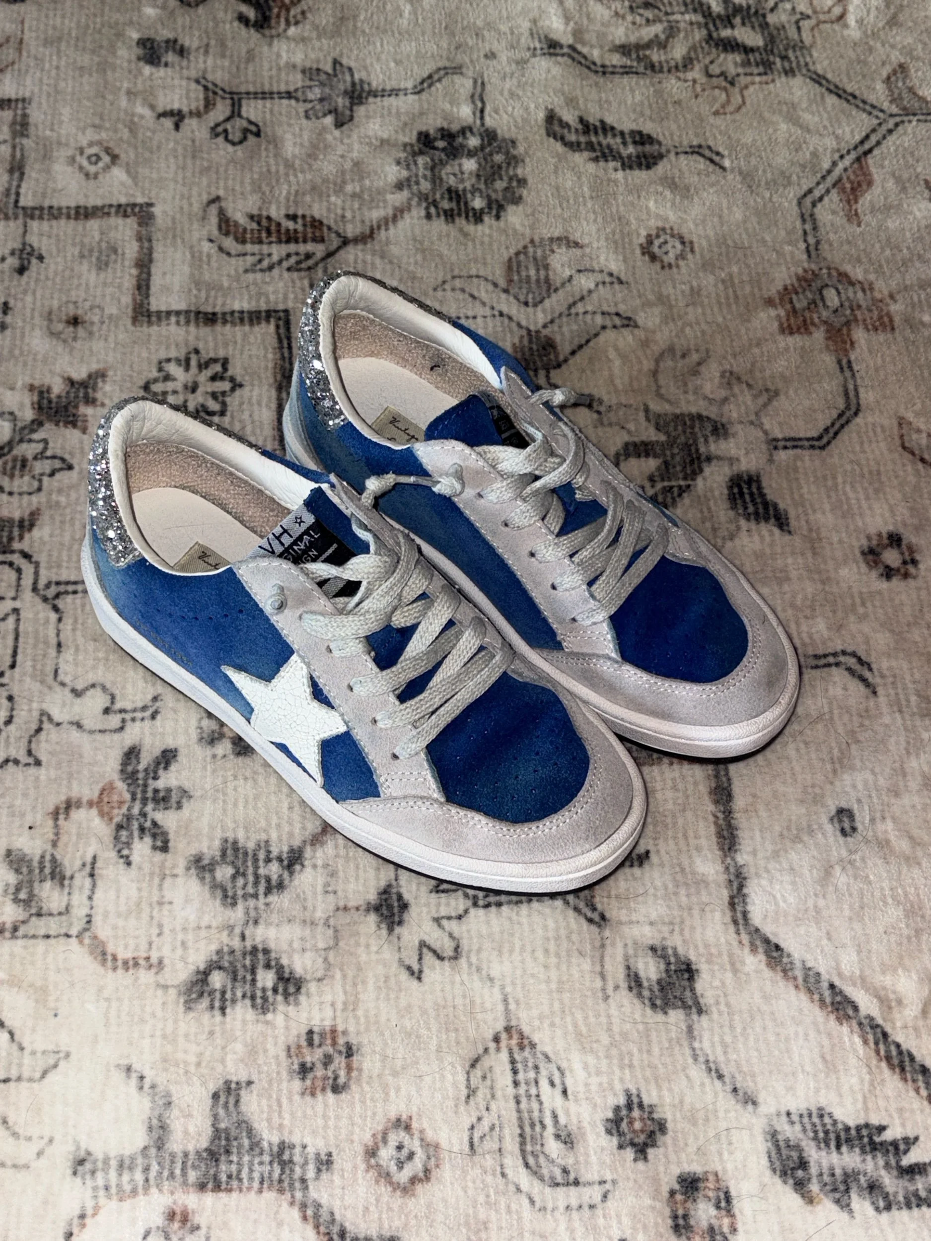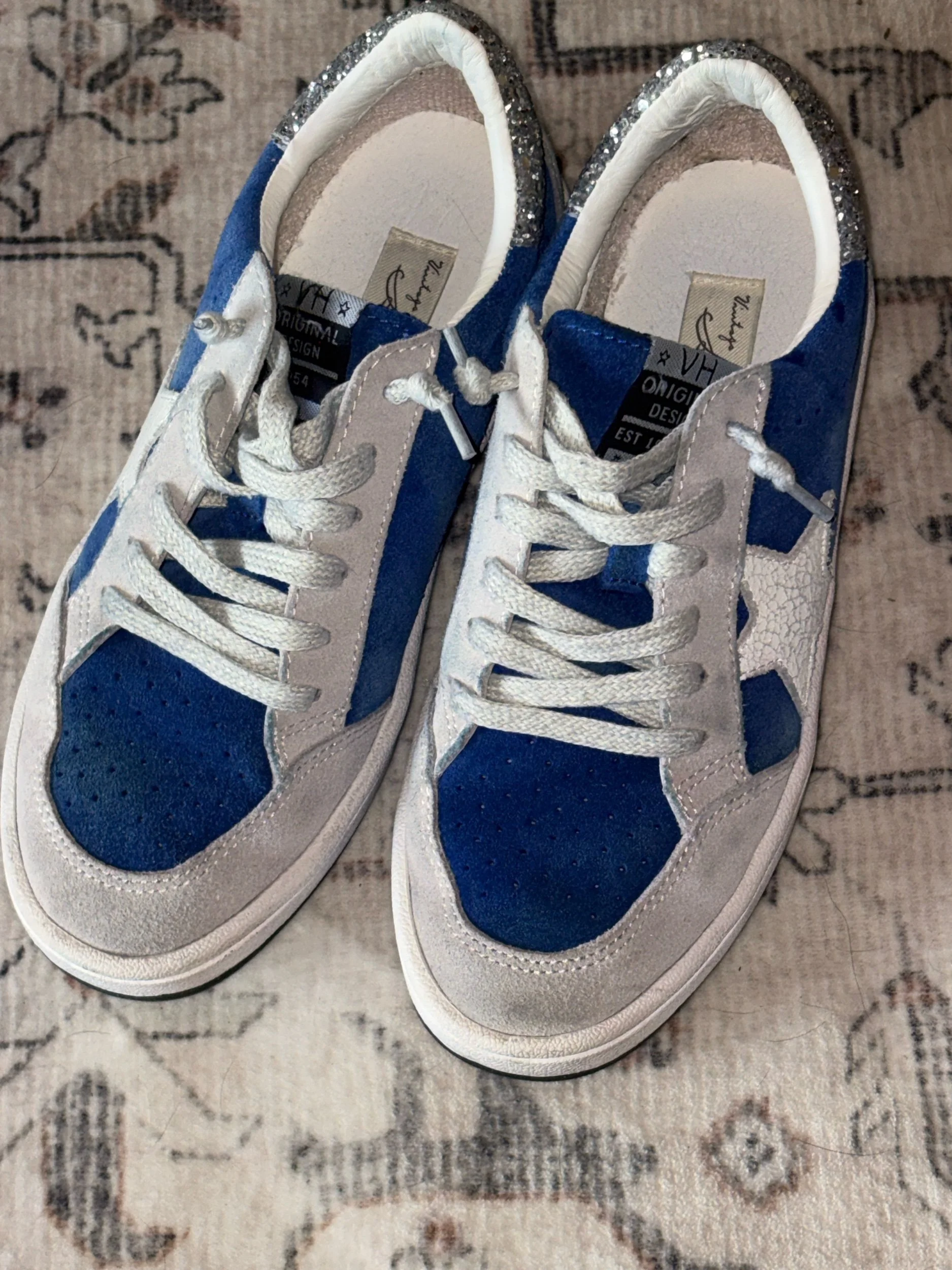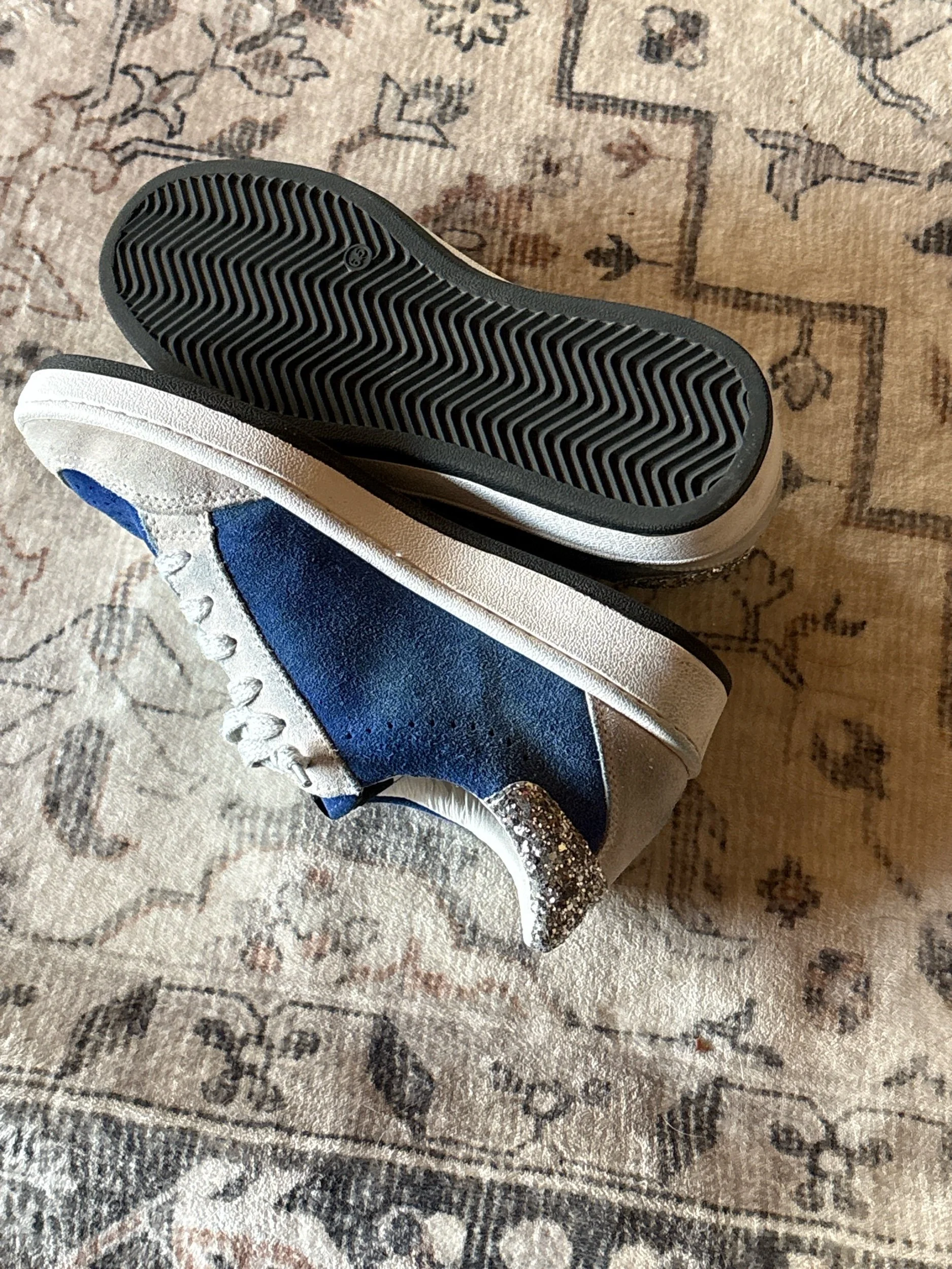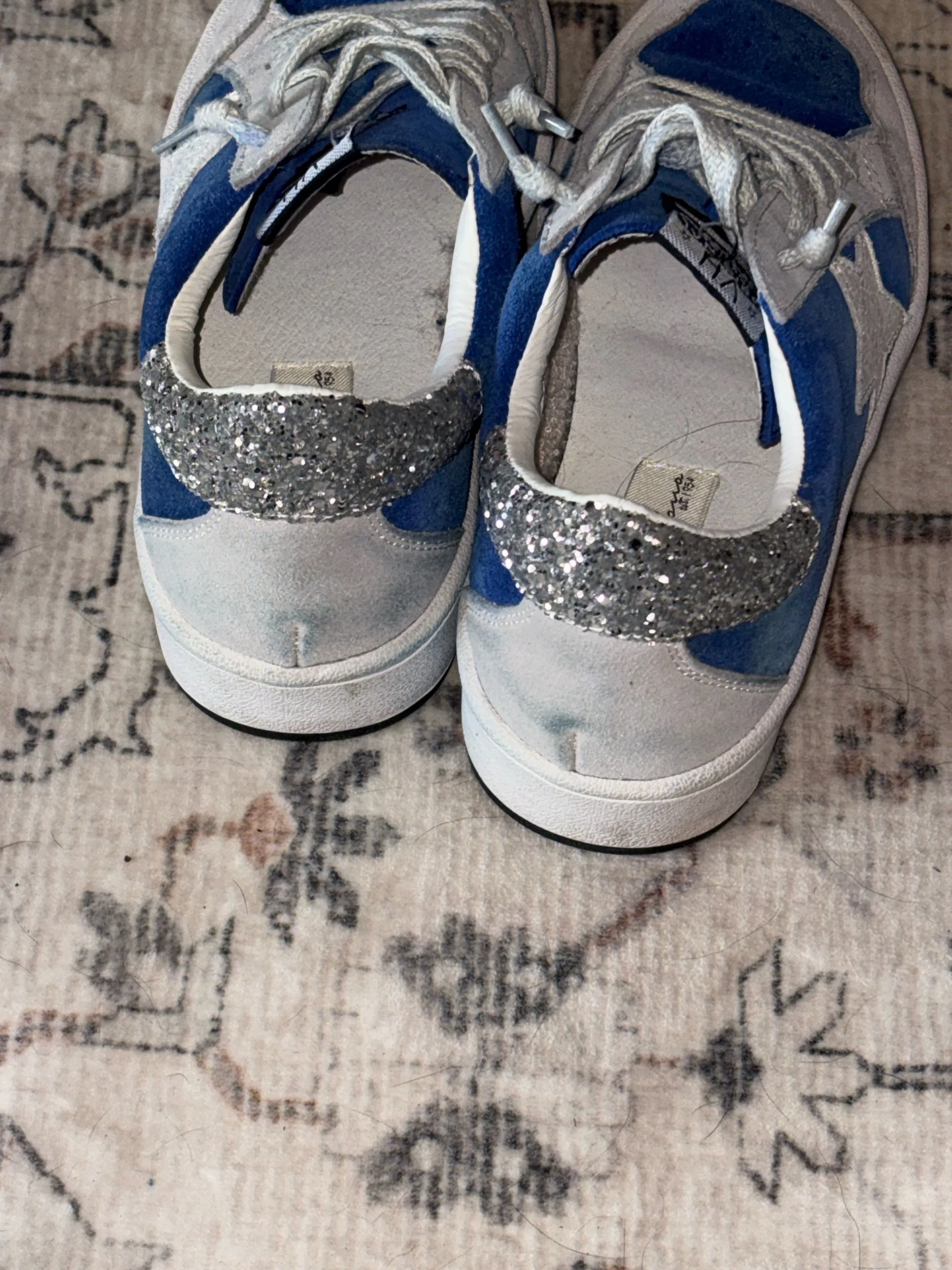 Perfect shade of UK blue!! There’s some staining on the gray suede from the blue in the back but not very noticeable. Soles and insides indicate very minor wear. These are absolutely adorable!!