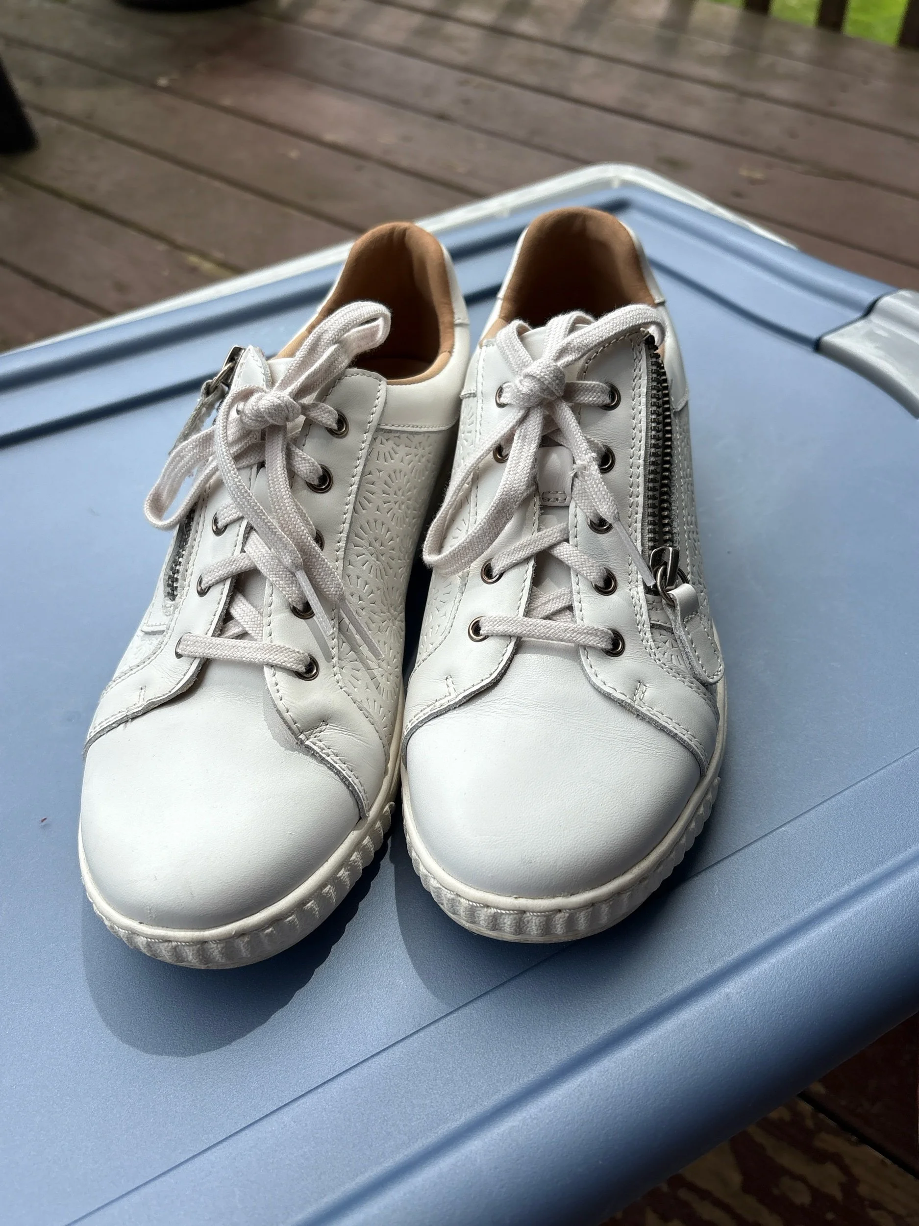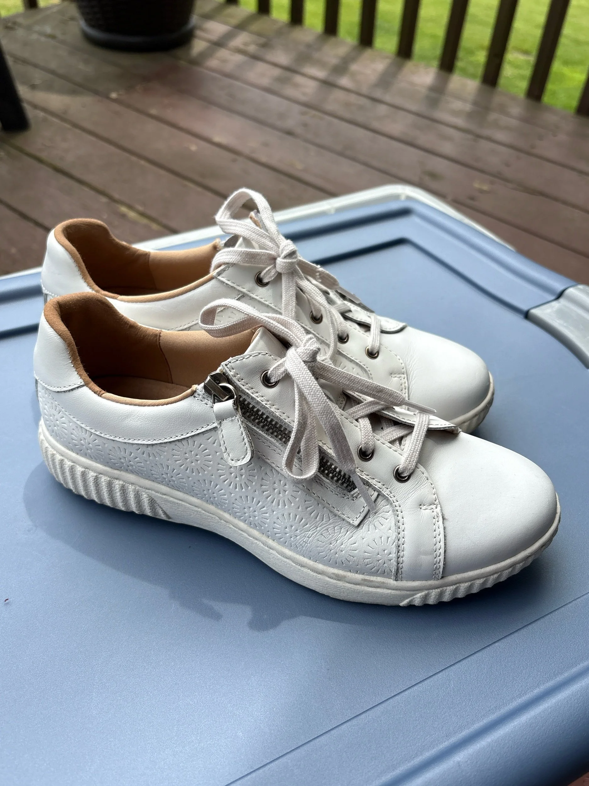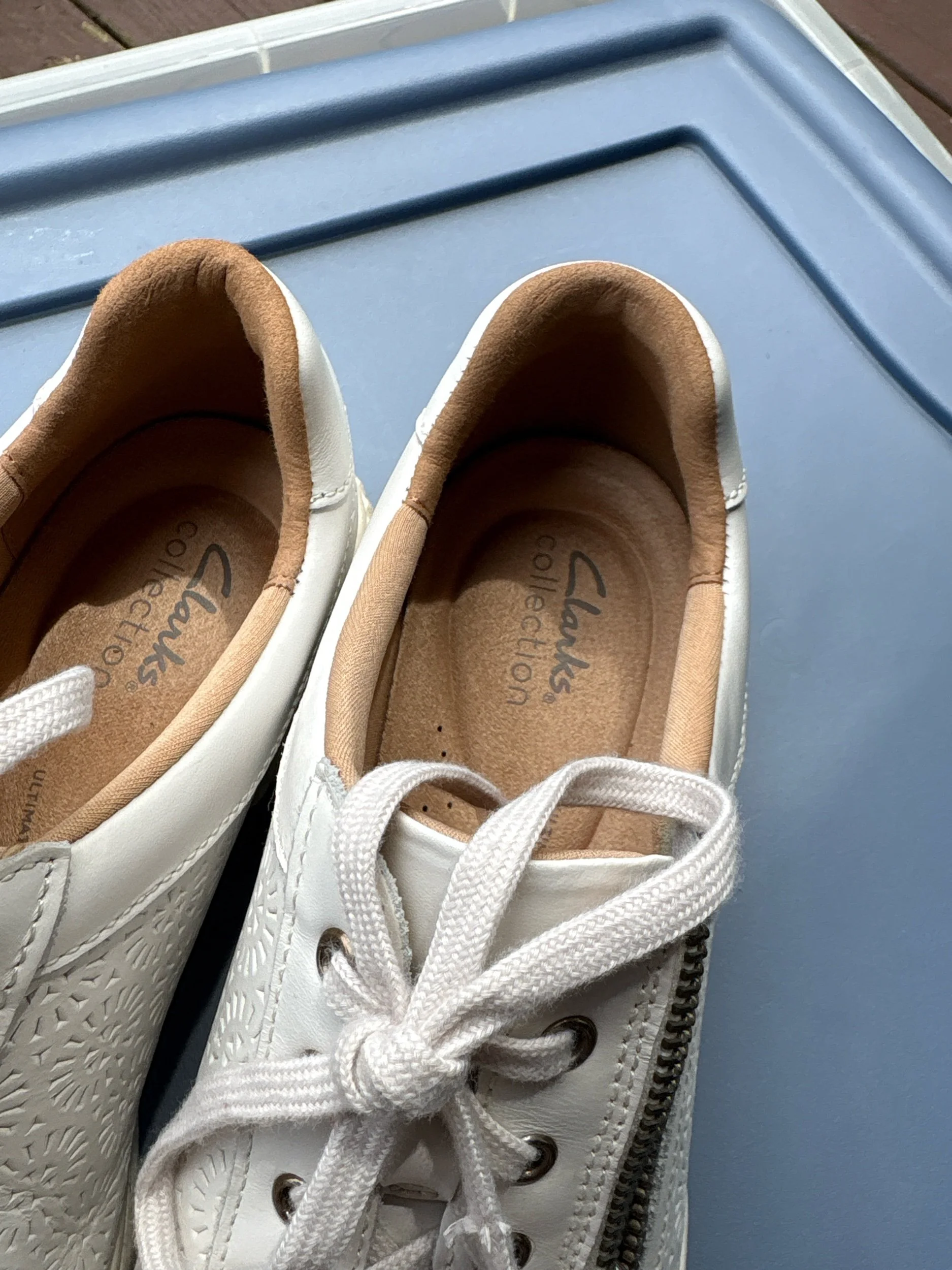 Clarks Women's size 8 Caroline Janna shoes, featuring a white leather upper, laser-cut floral details, and a functional side zipper for easy on and off