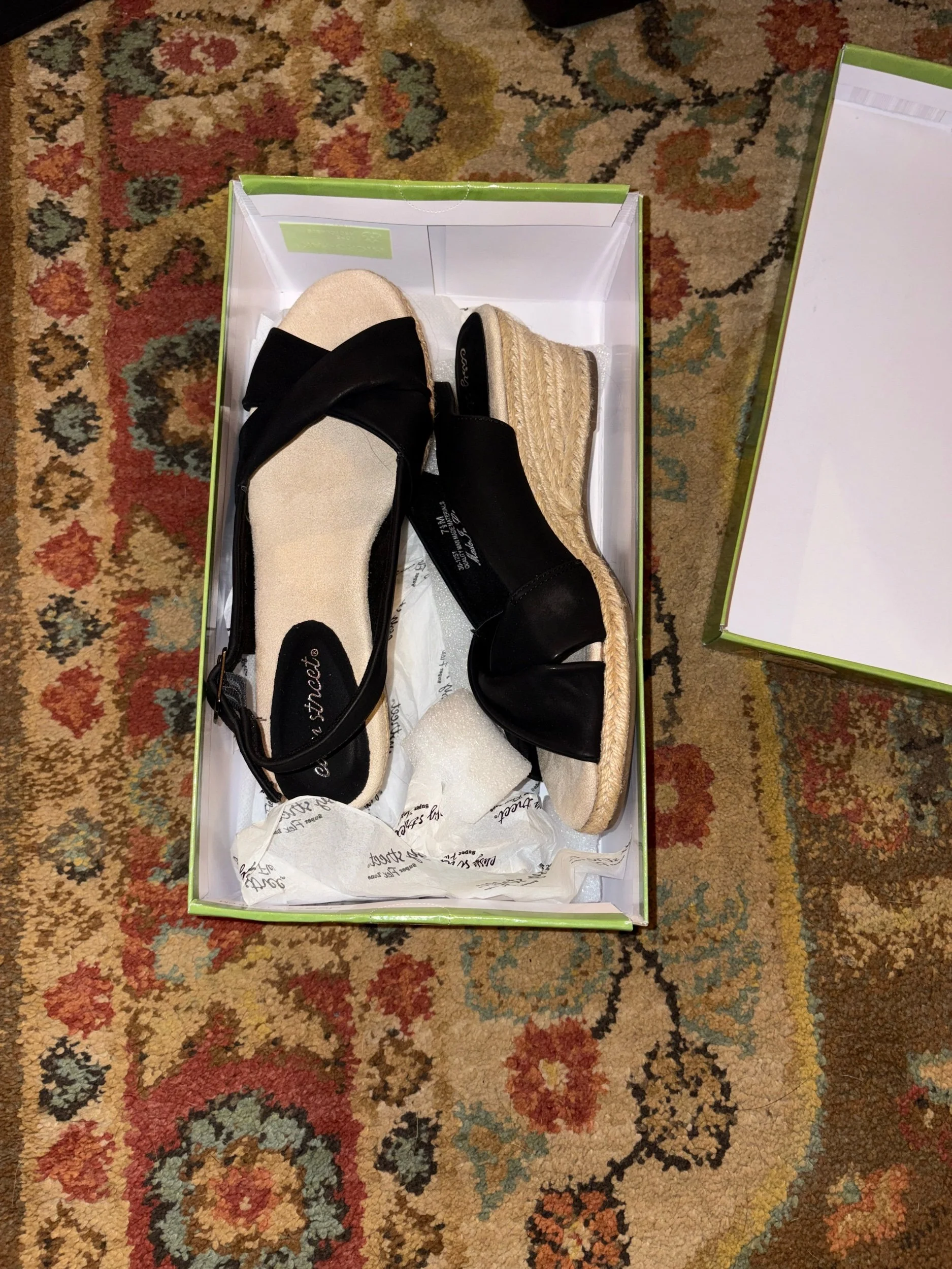 Online Store › New in box Easy Street Wedge Espadrilles Black Size 7 1/2 M Image 1 of 2 Image 2 of 2 New in box Easy Street Wedge Espadrilles Black Size 7 1/2 M $15.00 Beautiful new condition! Add To Cart Added! Beautiful new condition!