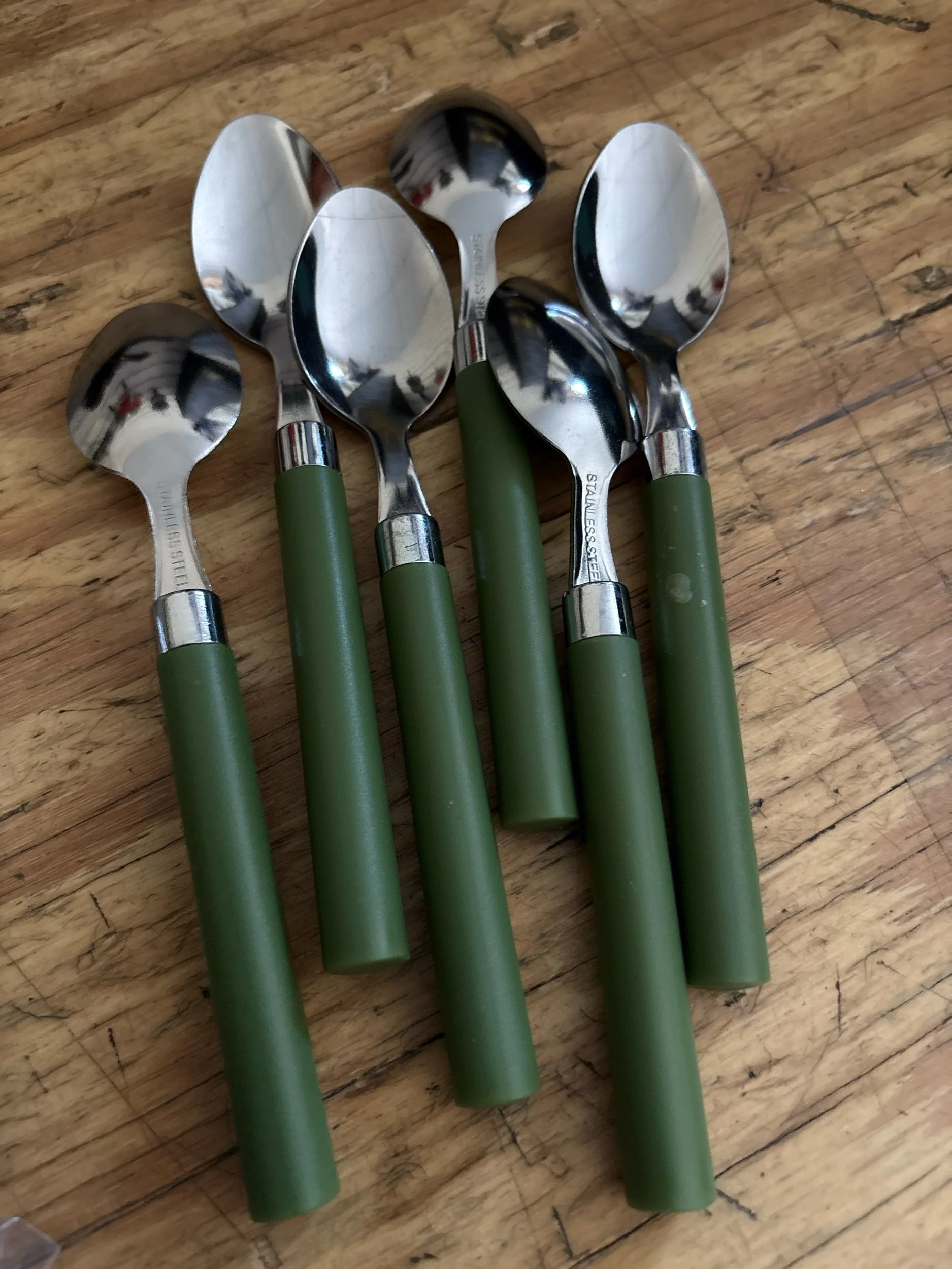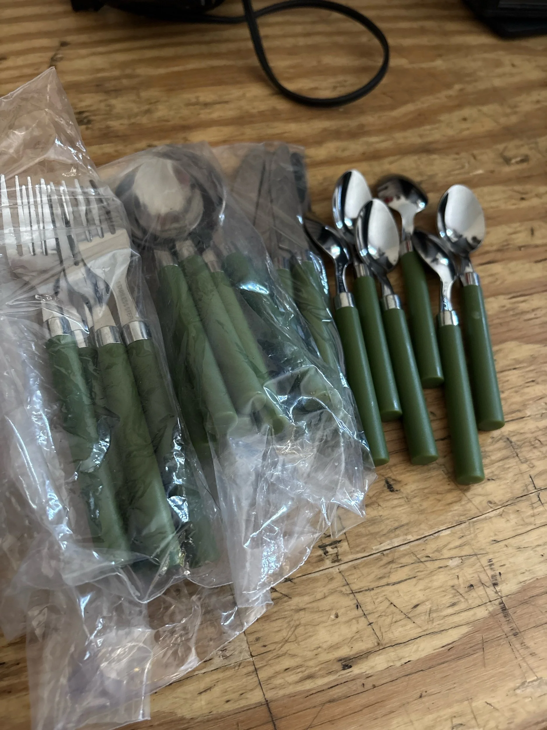 Online Store › 24 piece green and stainless cutlery set Image 1 of 2 Image 2 of 2 24 piece green and stainless cutlery set $16.00 6 each of big spoons, small spoons, forks, and butter knives. Add To Cart Added! 6 each of big spoons, small spoons, forks, and butter knives.