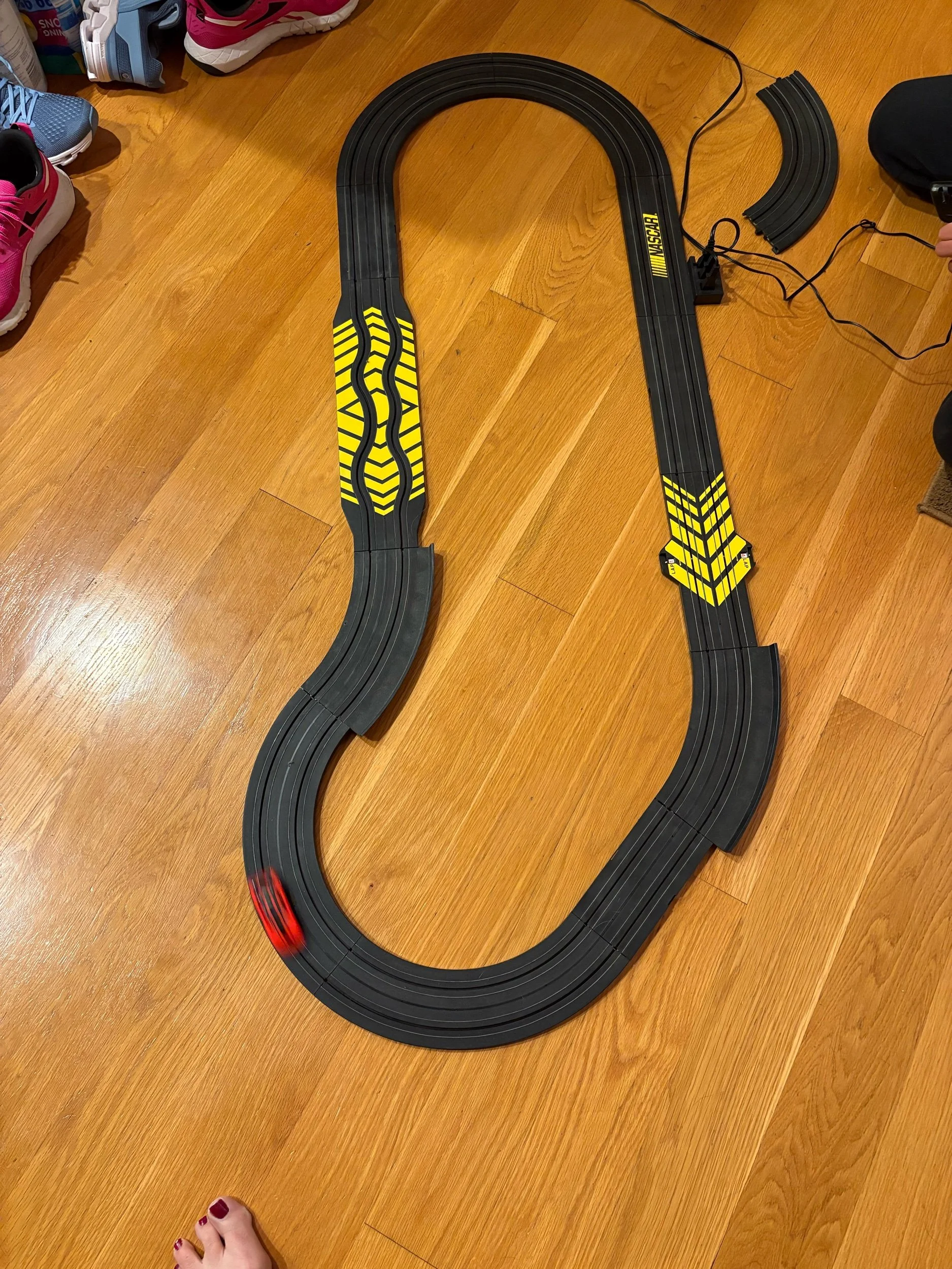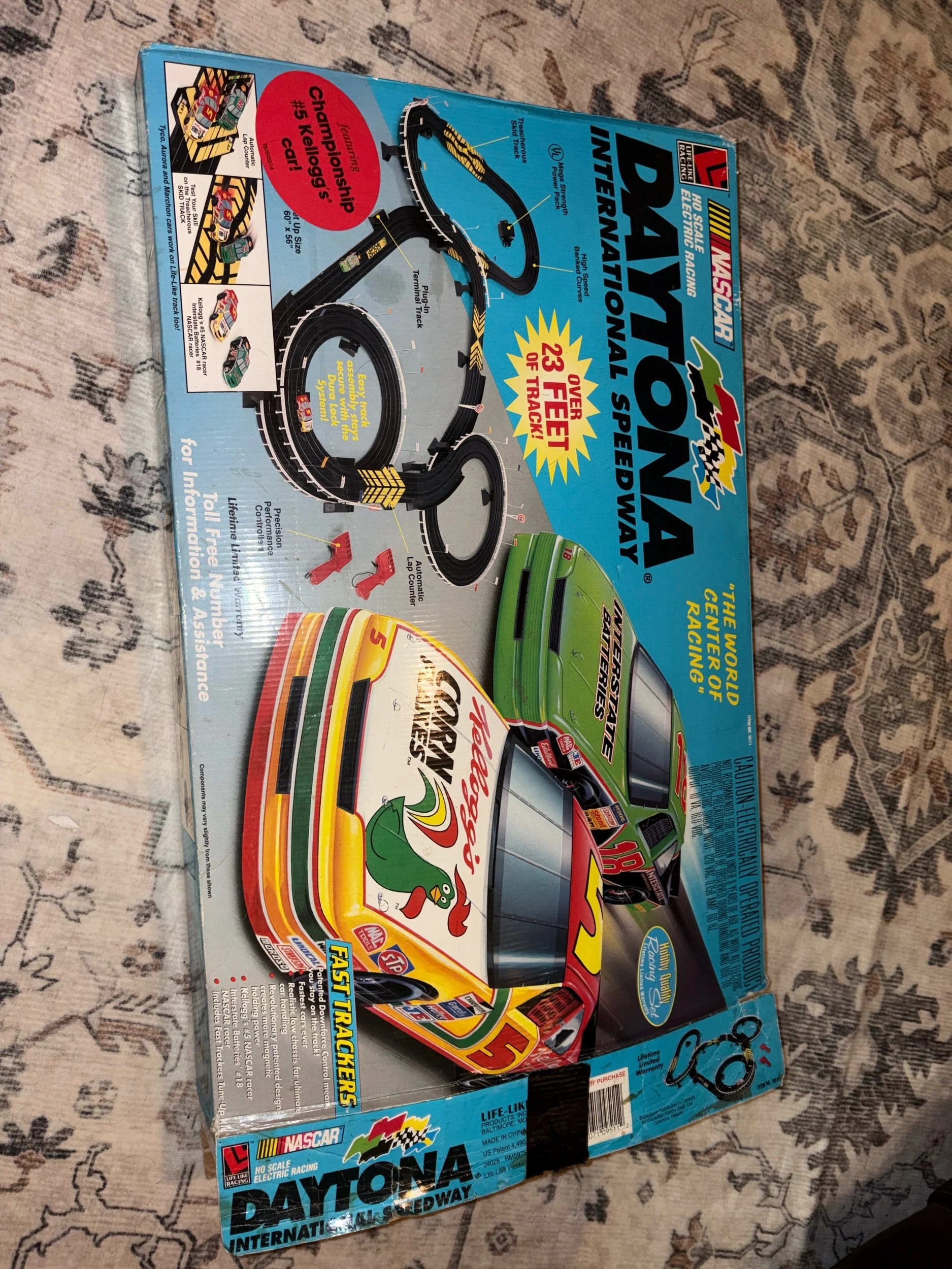 One of the cars is broken. Did not count pieces but there’s a lot of track and accessories. It was tested and did work but needed some manual warming up. Pretty neat piece of nostalgia.
