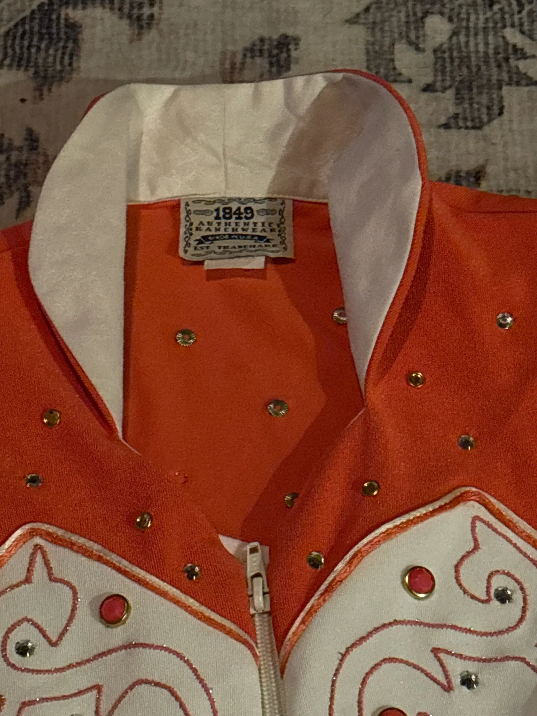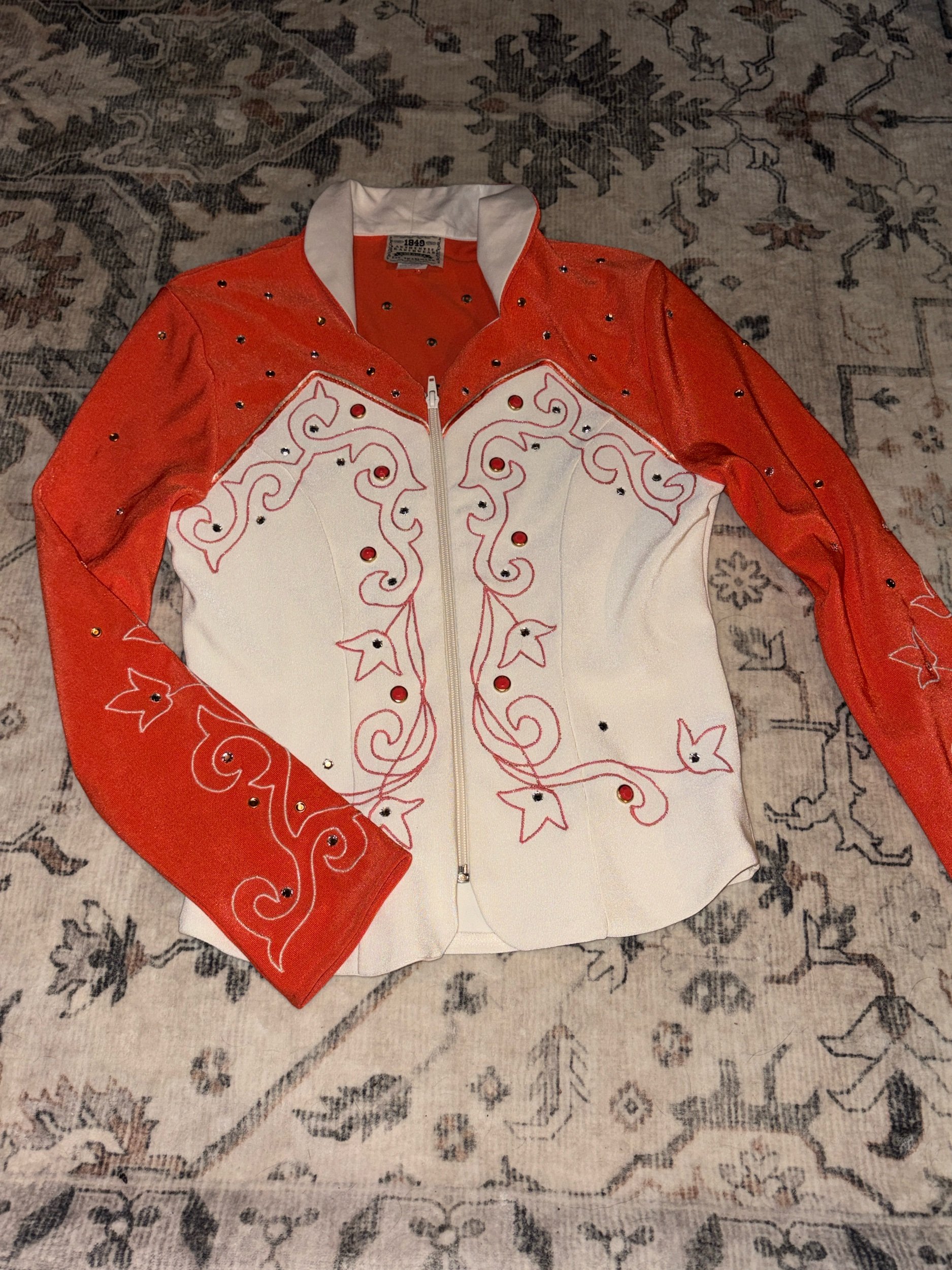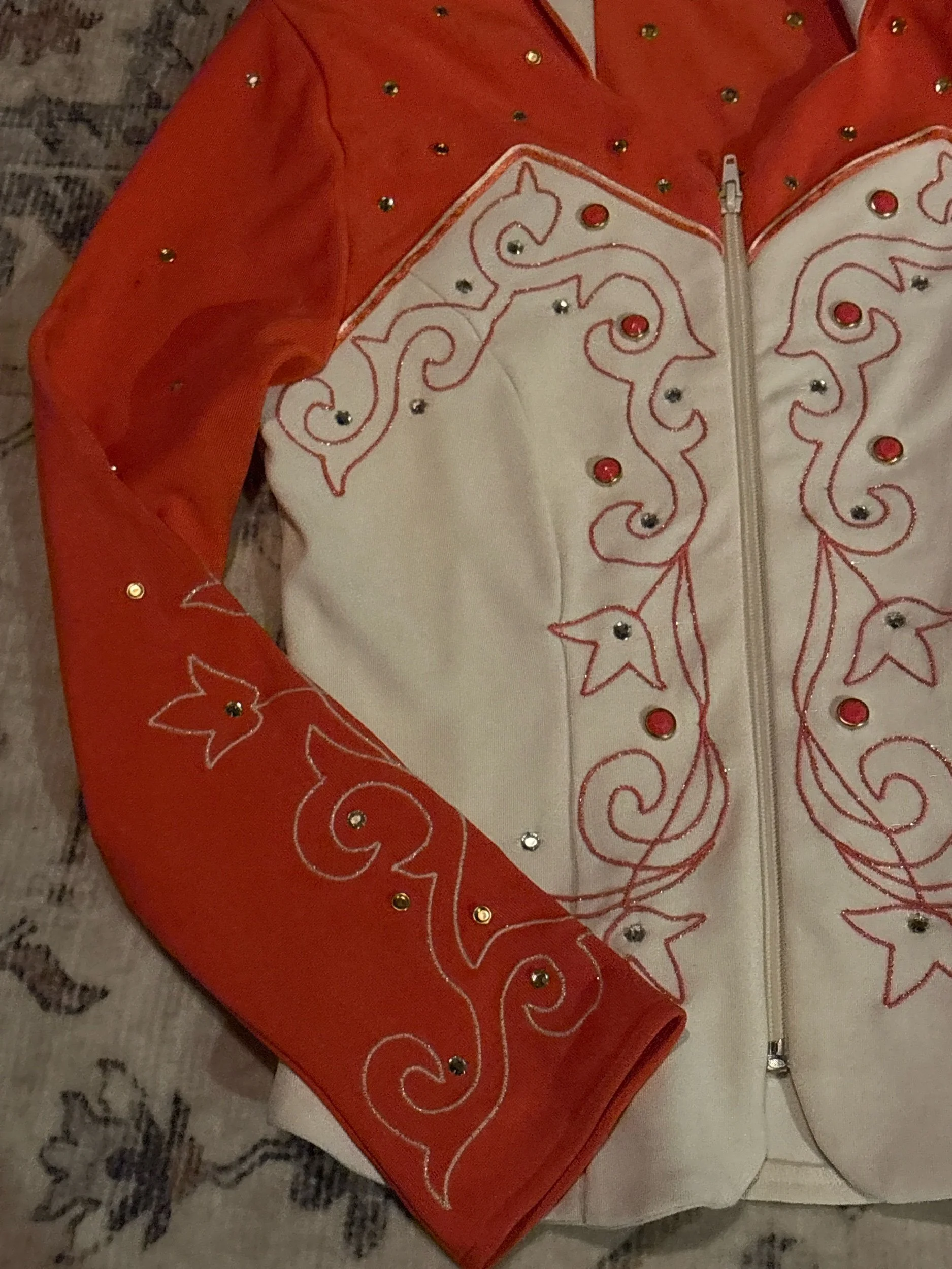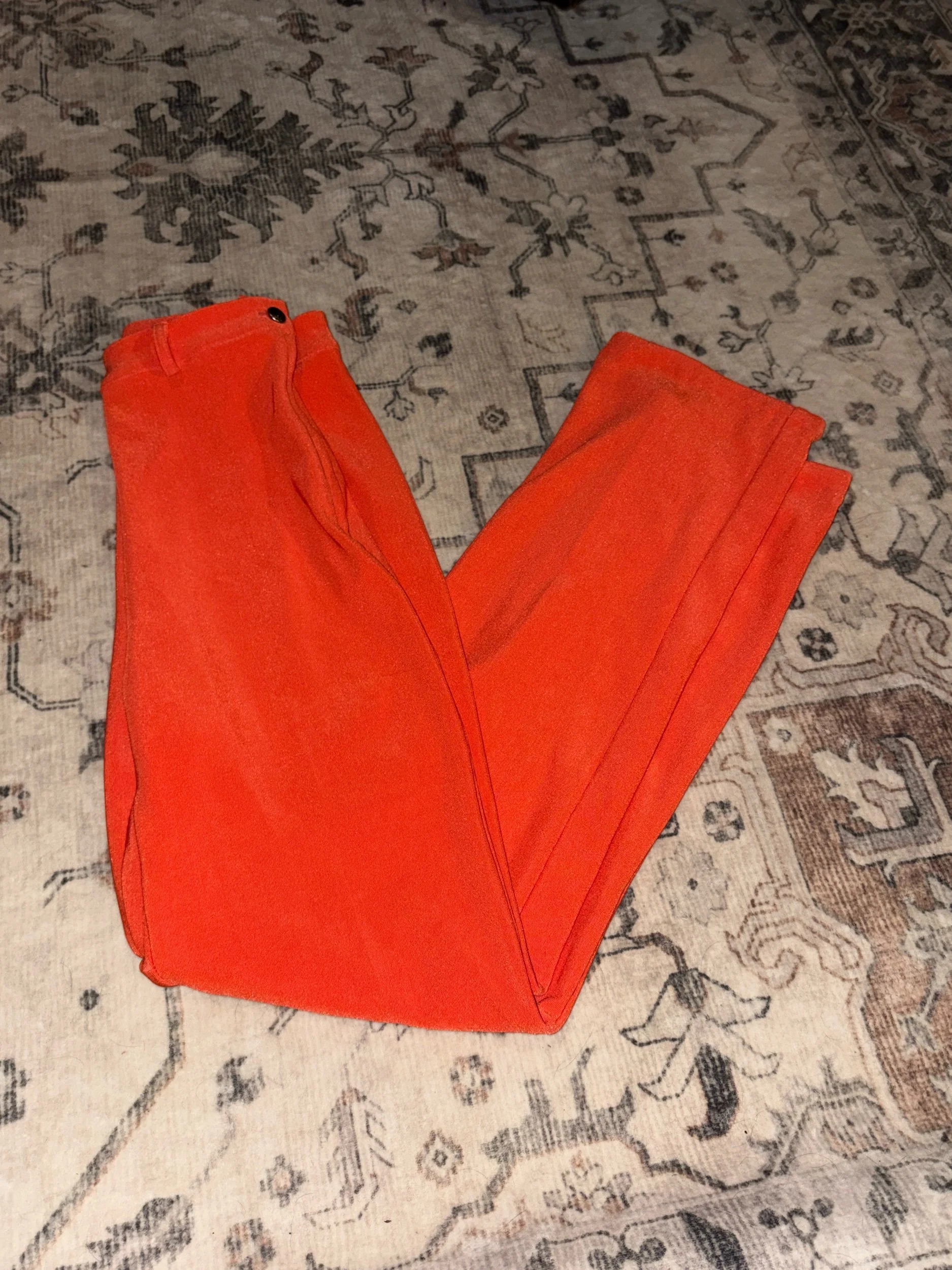 Zipper front, beautiful condition. Color is more of a coral and ivory. Pants zip and button on the side for a flat front. Both pieces sized XSmall.