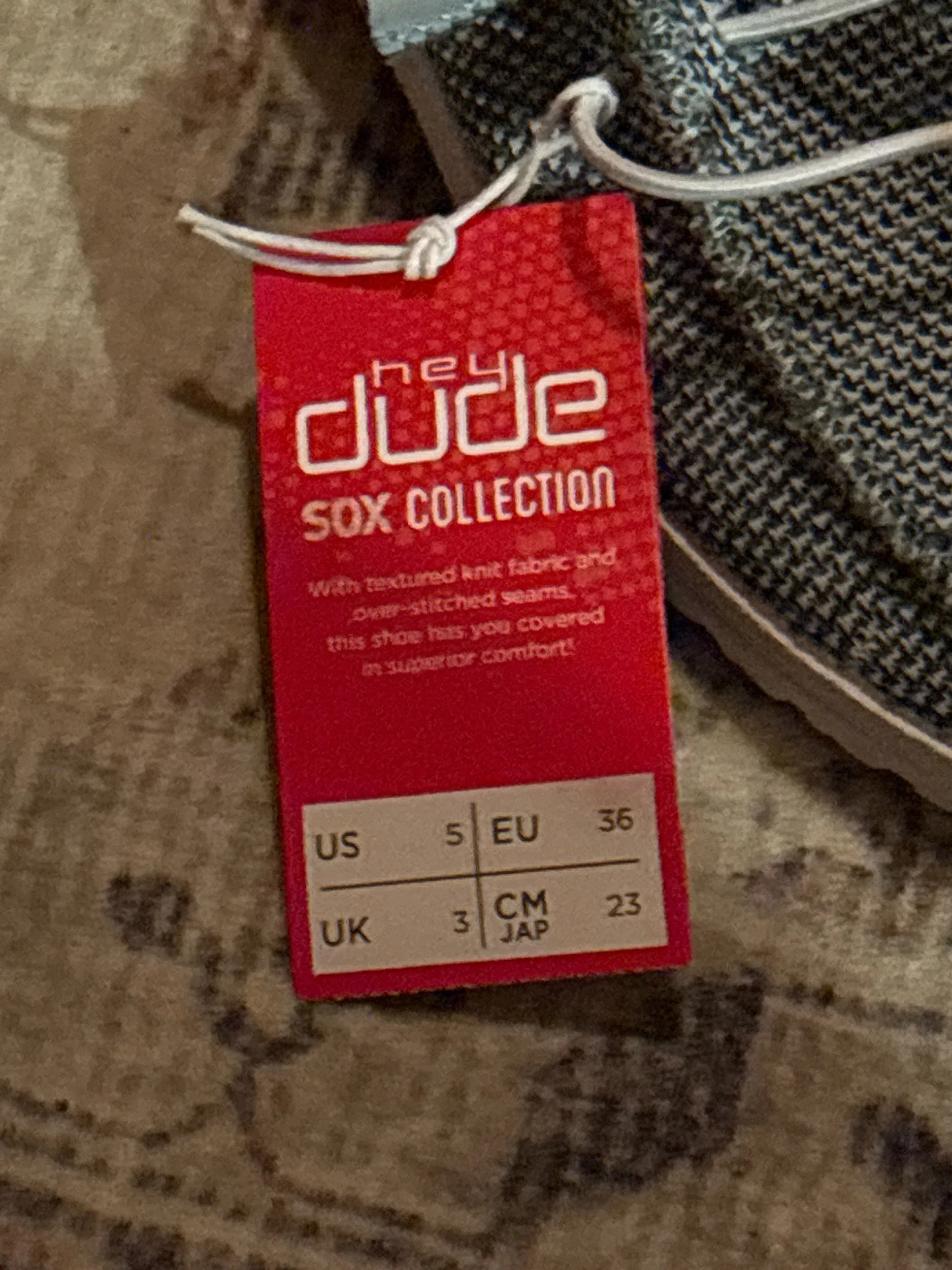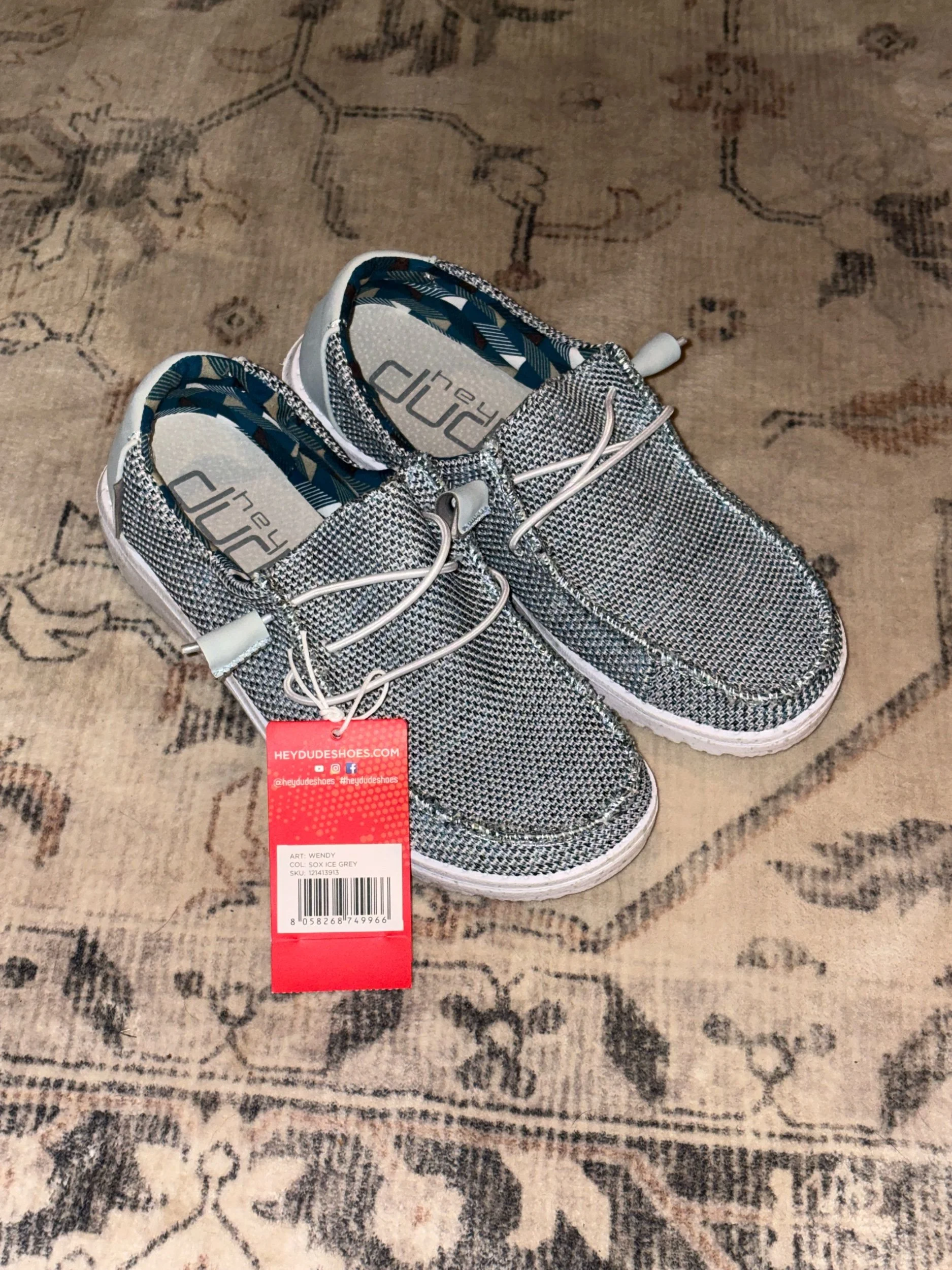 Online Store › Hey Dude Wendy Sox Ice Grey NWT Size 5 Image 1 of 2 Image 2 of 2 Hey Dude Wendy Sox Ice Grey NWT Size 5 $18.00 Brand new with tag! Really nice subtle teal color. Add To Cart Added! Brand new with tag! Really nice subtle teal color.