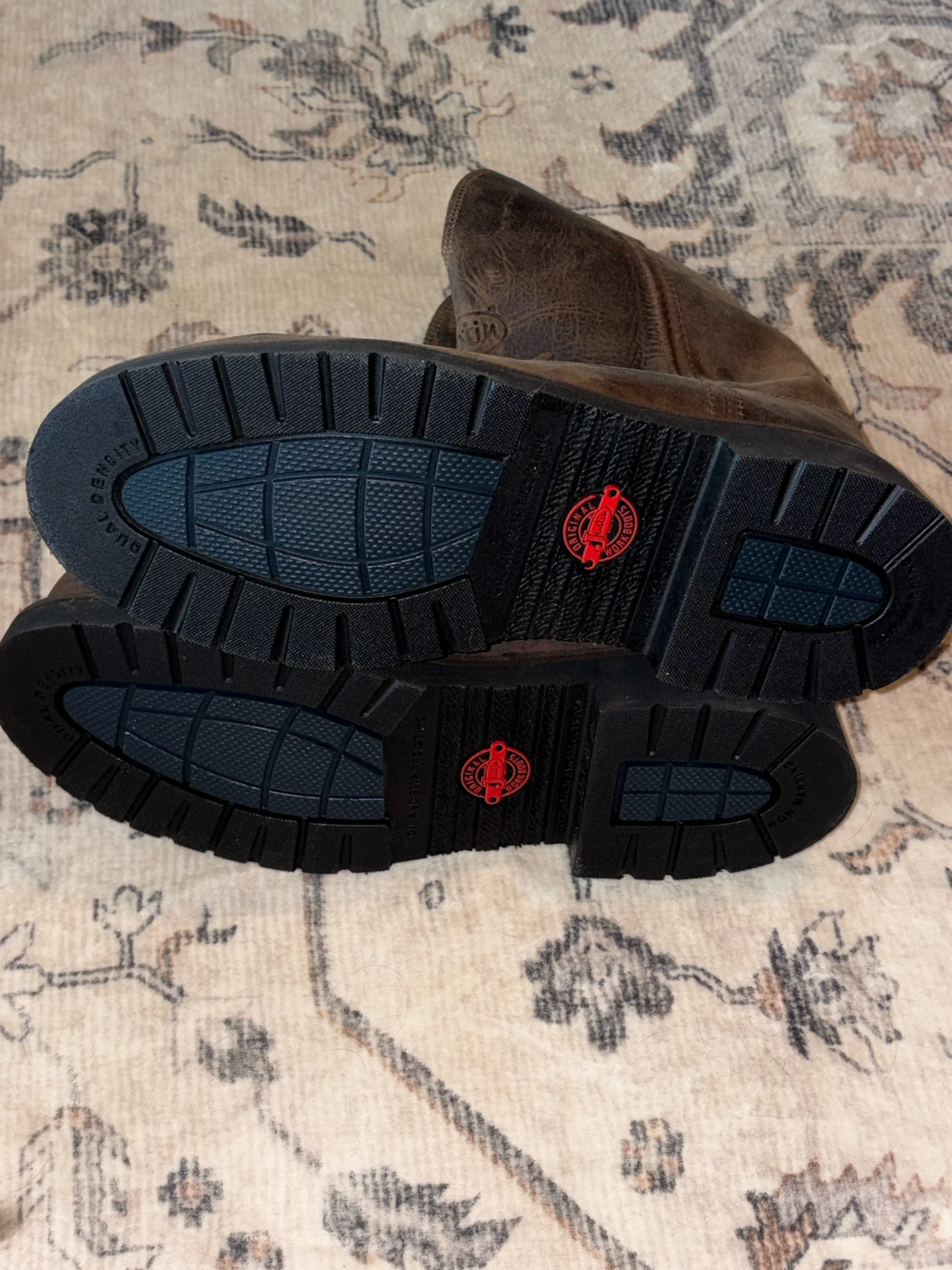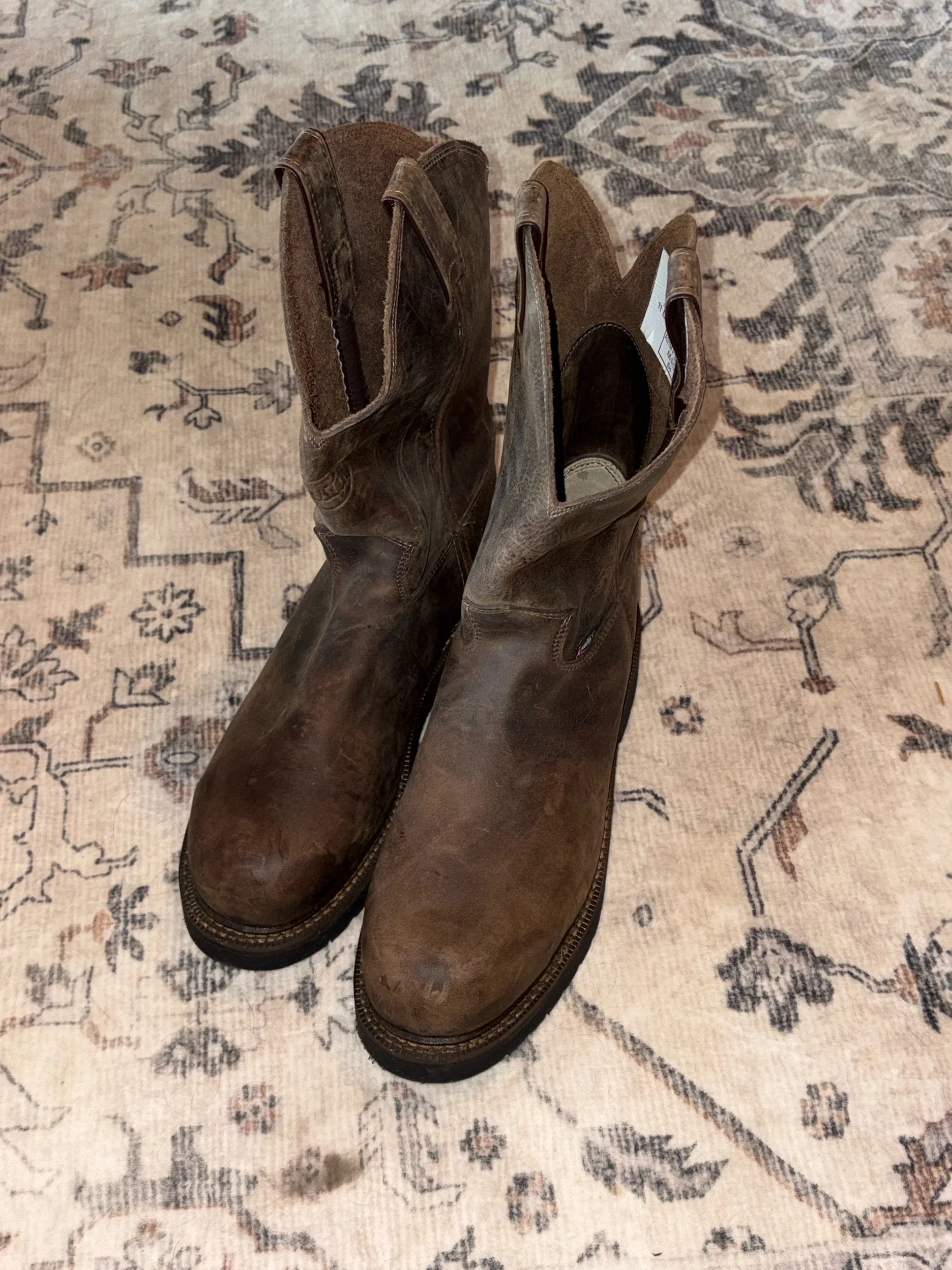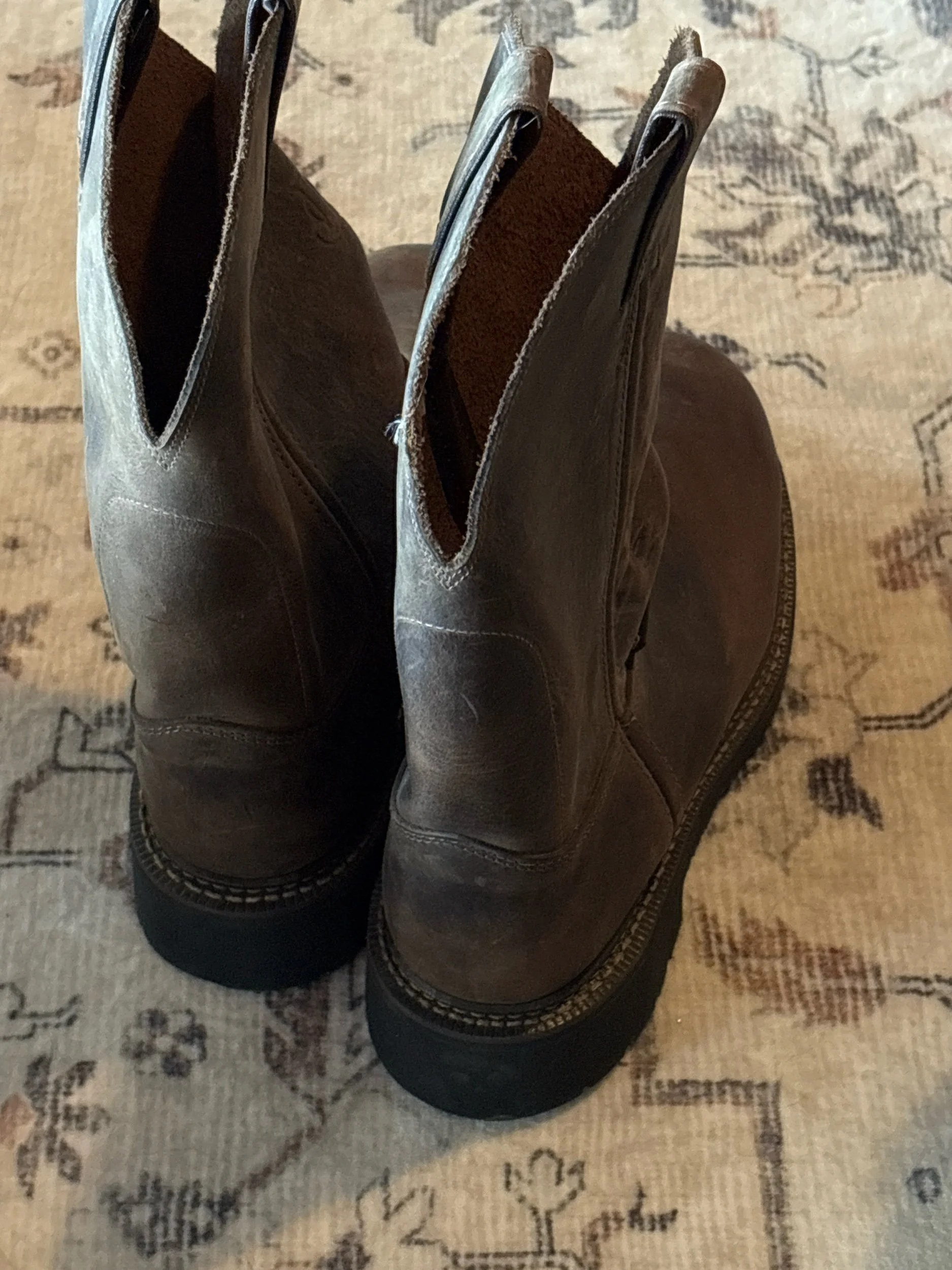 Based on the soles, these have not been worn at all. They do need some reshaping (could stuff with tissue paper) but look normal when pulled on. Retail for $260