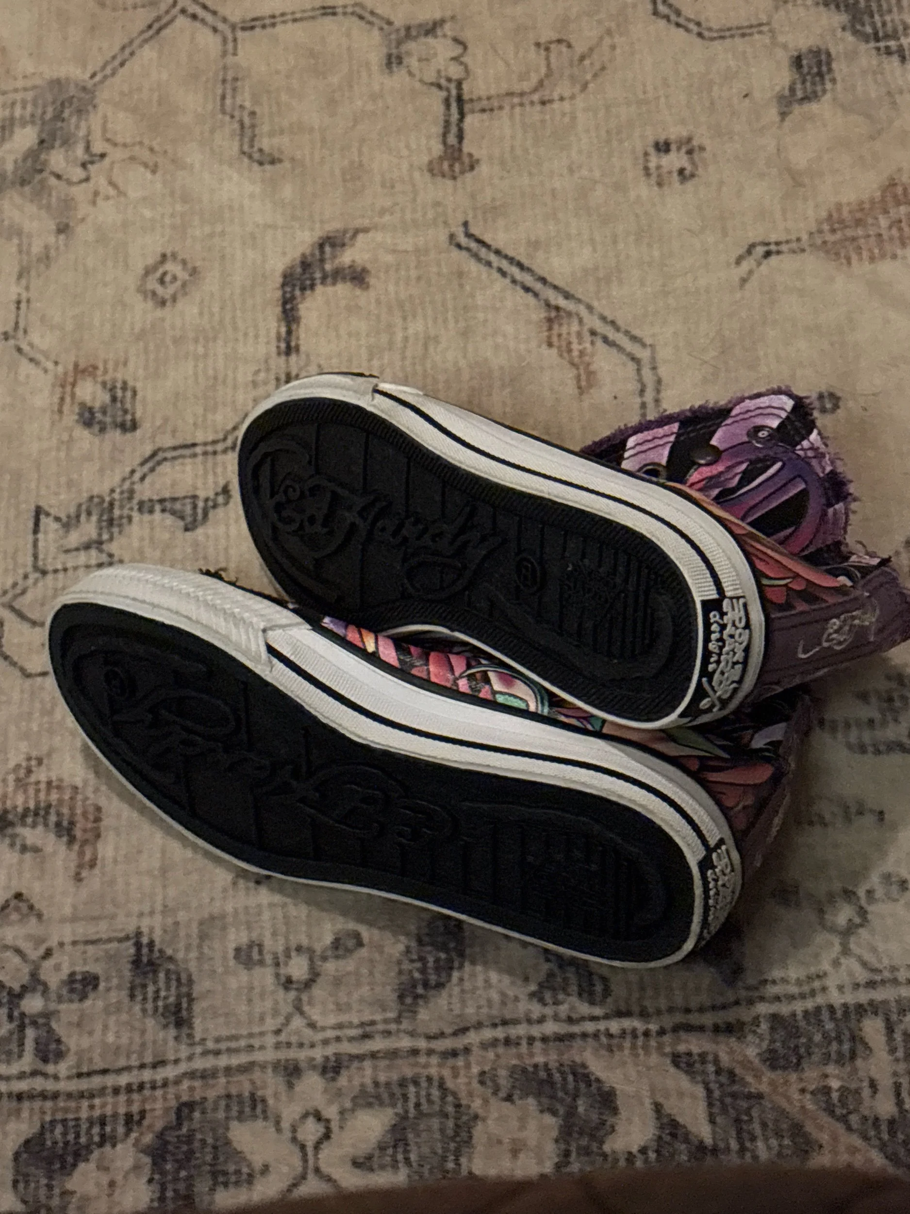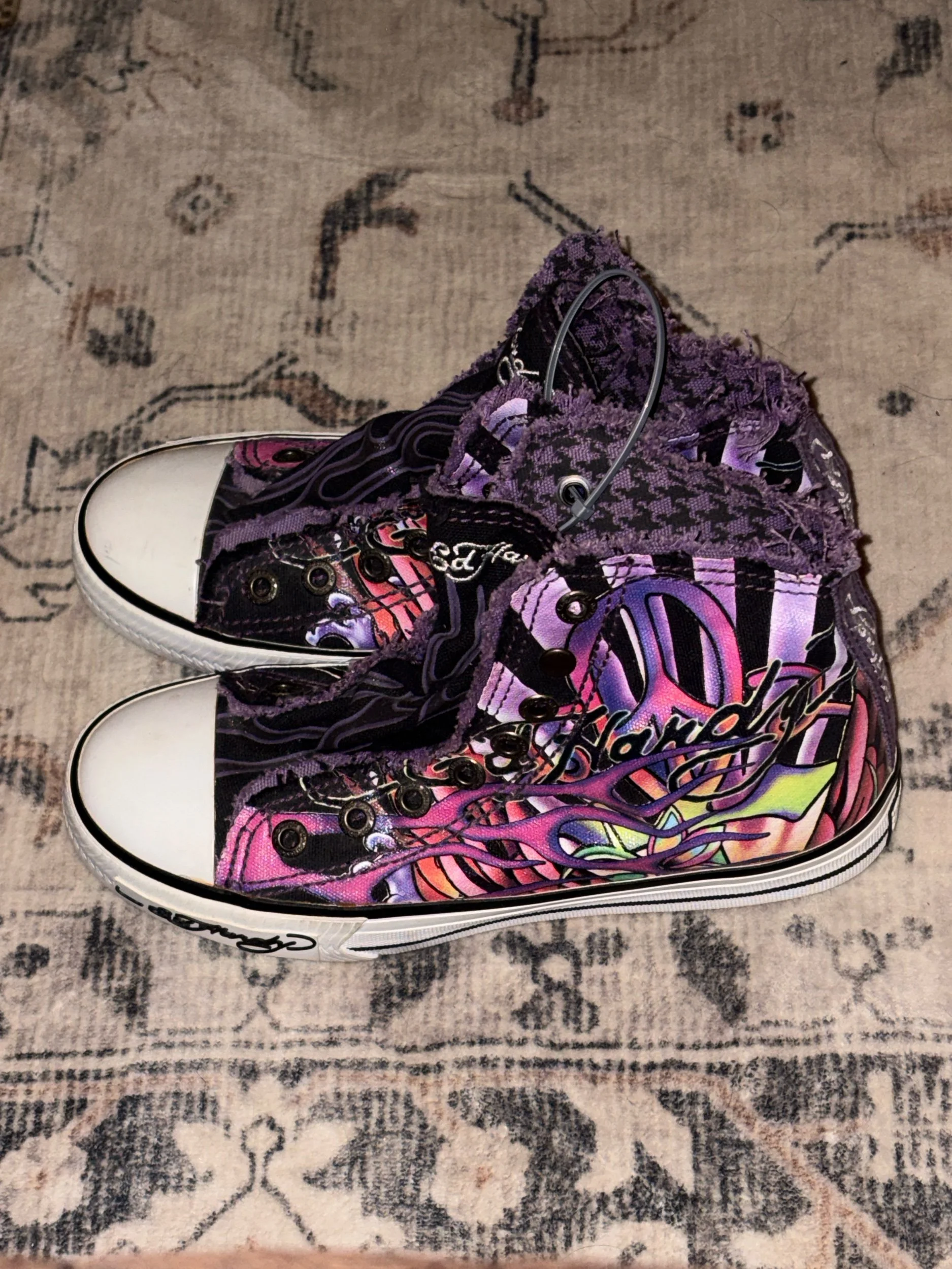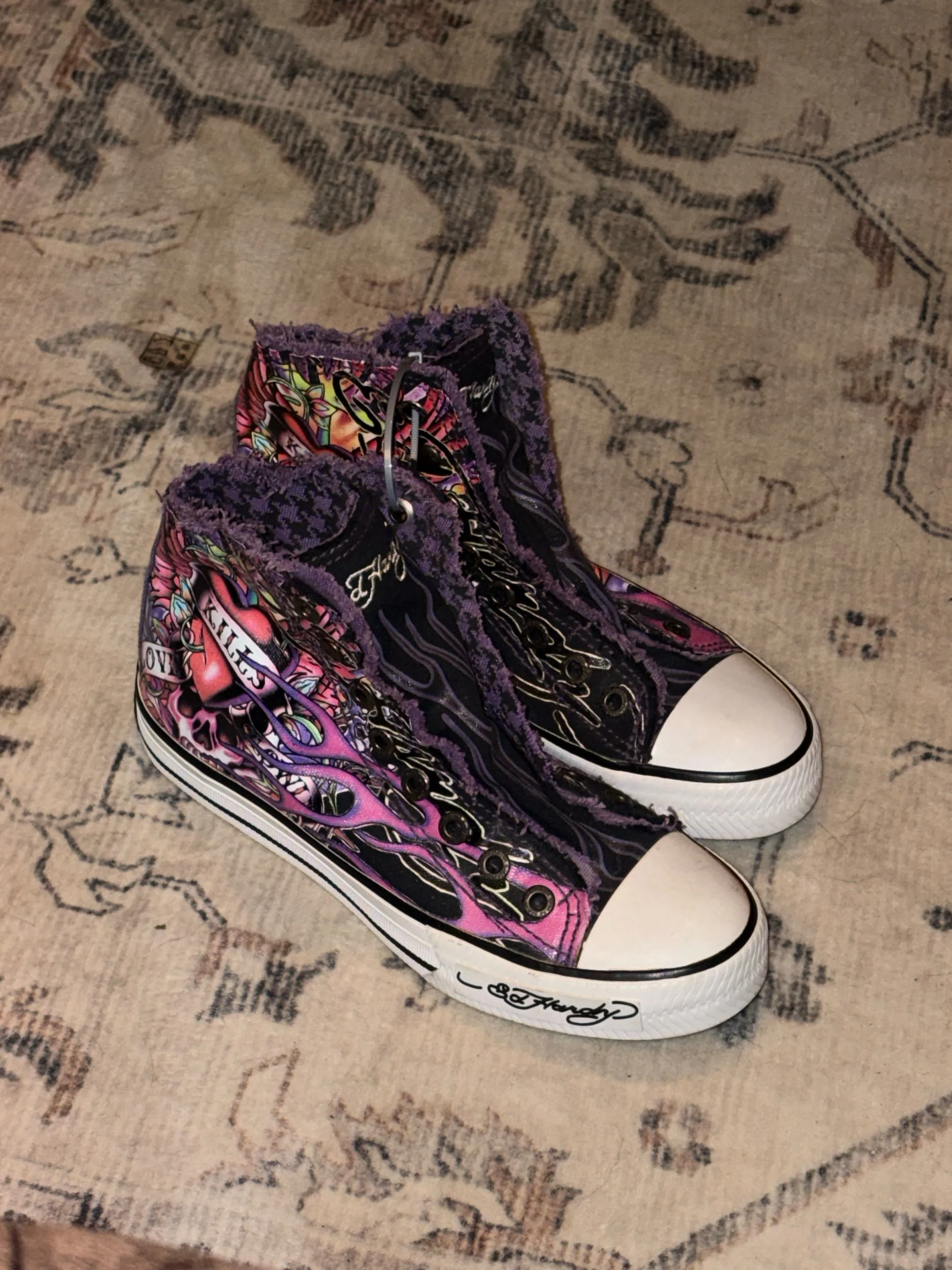 Ed Hardy high-top sneakers featuring the brand's signature tattoo-inspired artwork, including a "Love Kills" graphic and flame details