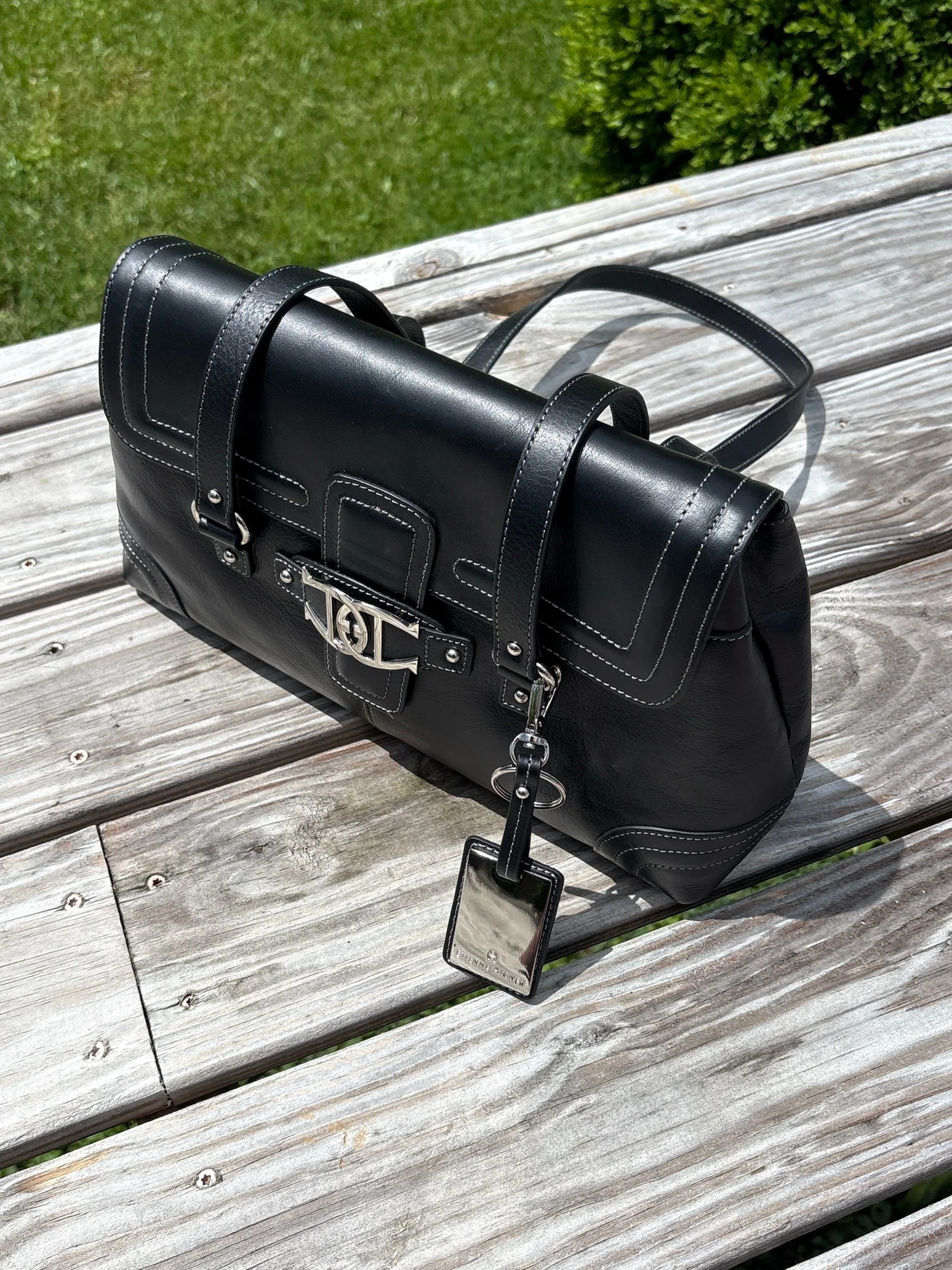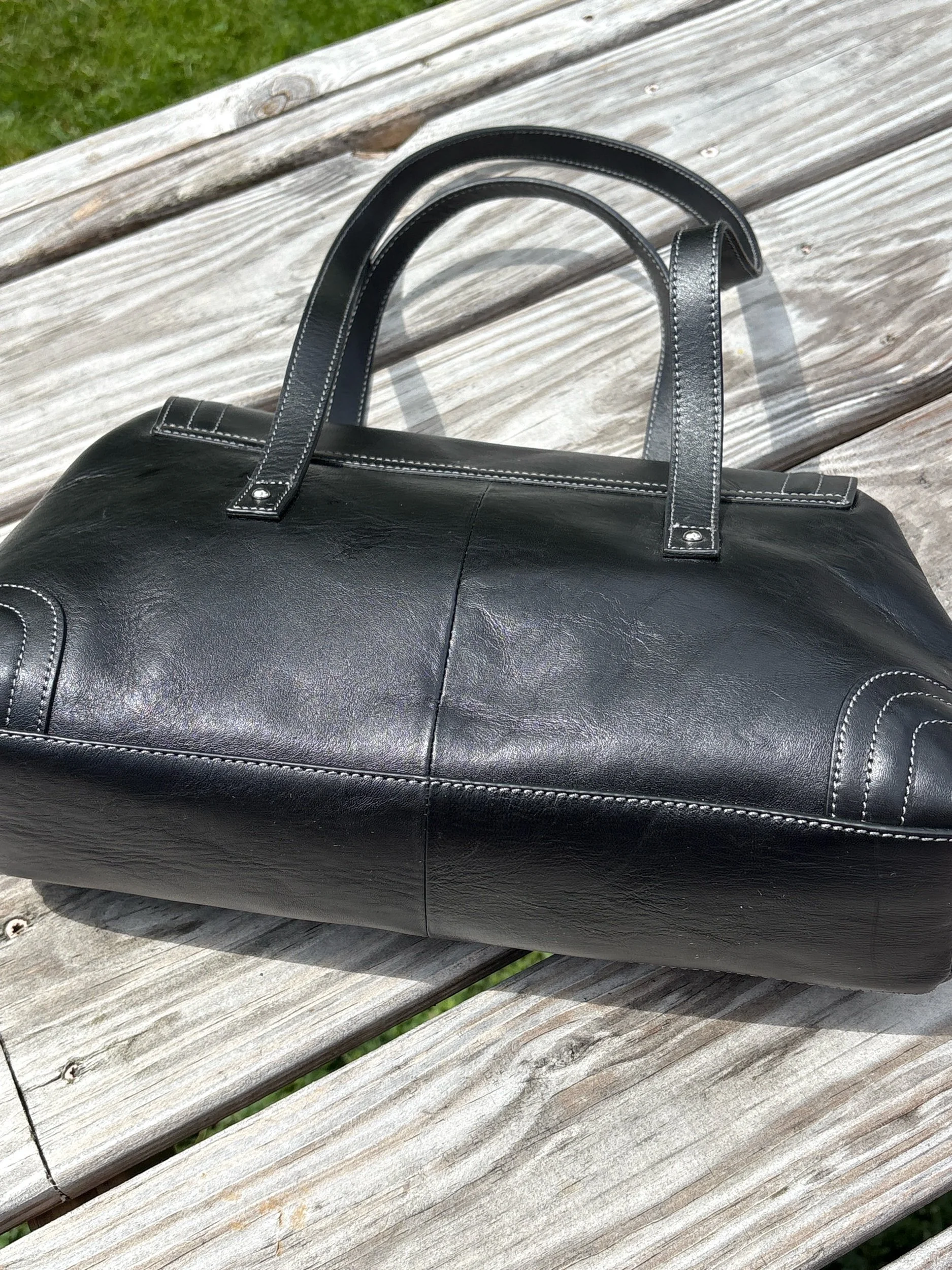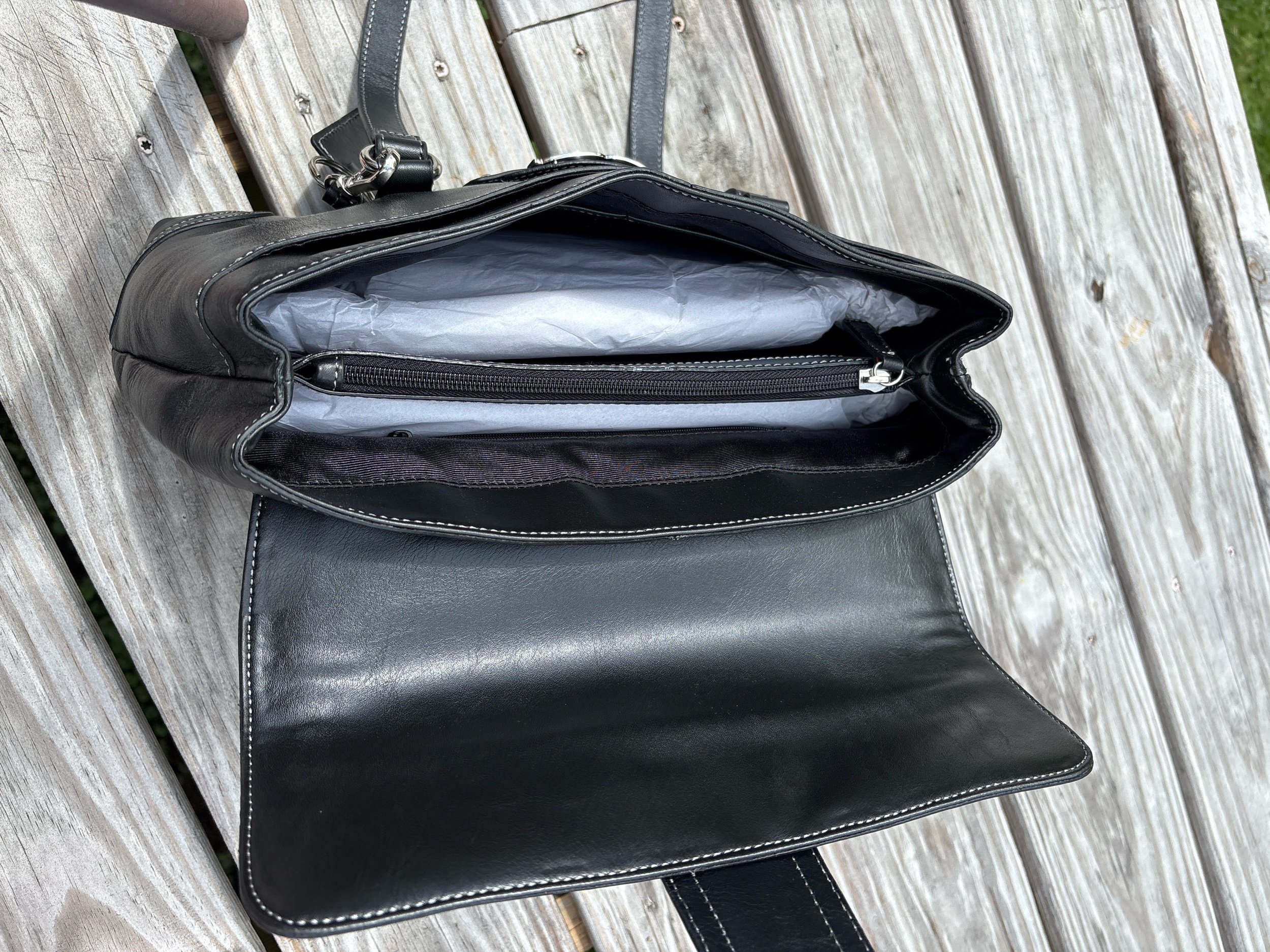 A little over a foot long, about 4” wide on the bottom, and 8” tall. 3 nice pockets inside plus 2 zippered pockets. Retail $175