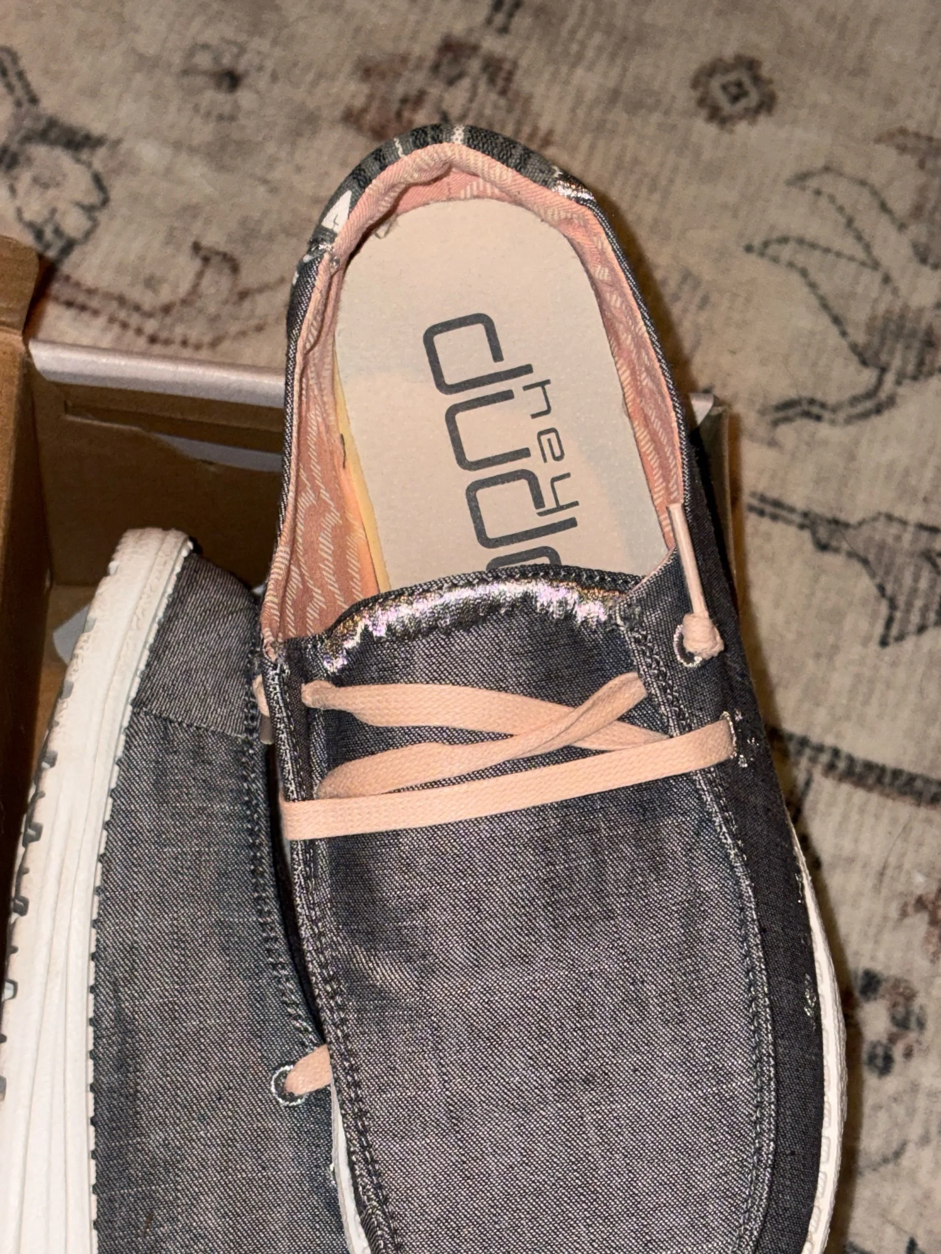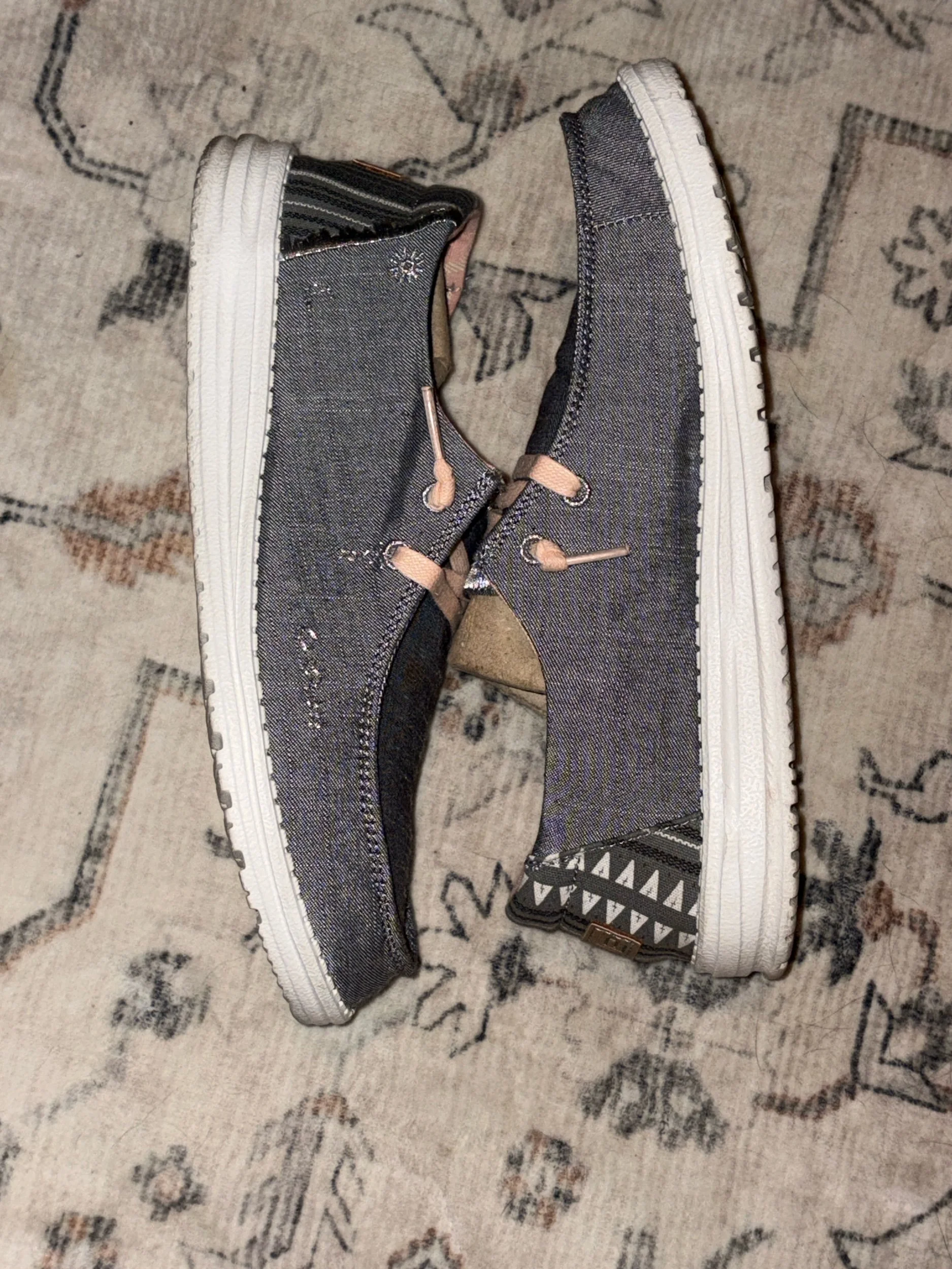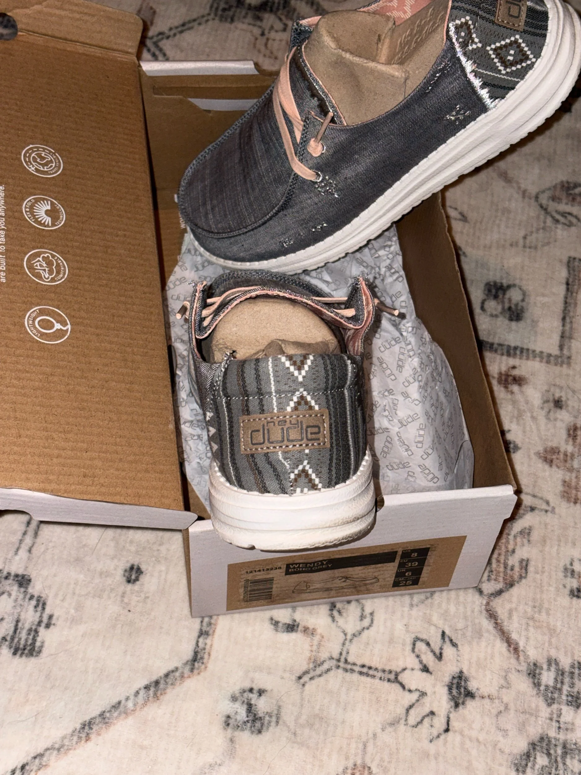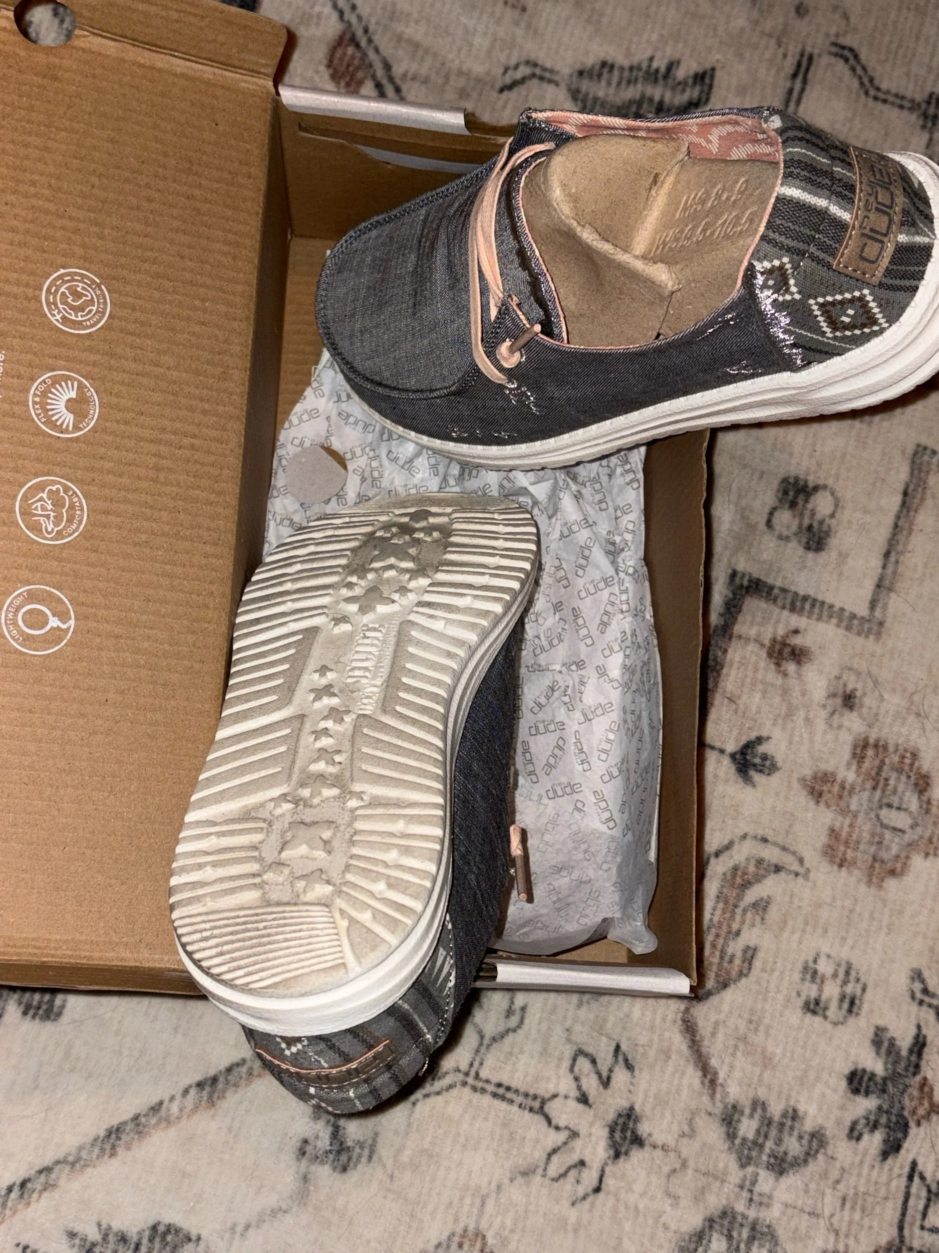 Very cute hey dudes!! Uppers and insoles are perfect and really look new, but the bottoms show they were worn at least once. Box included!
